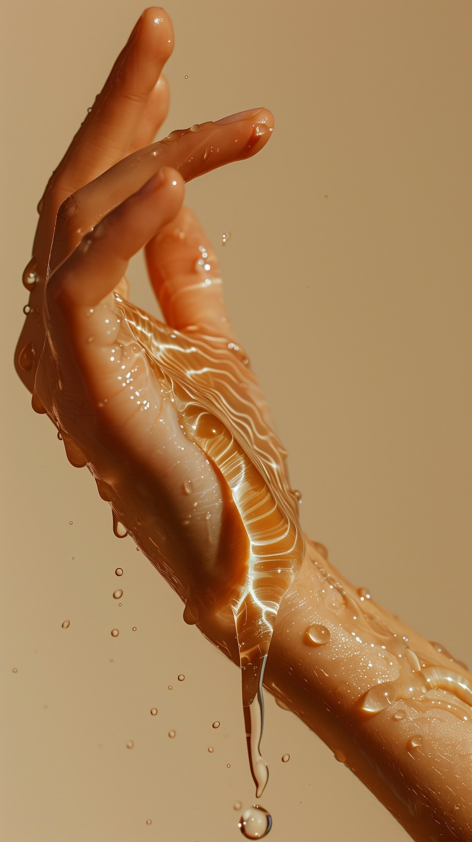 Close-up of a hand with liquid droplets, creating a shimmering effect against a beige background. Artistic focus on light and texture.