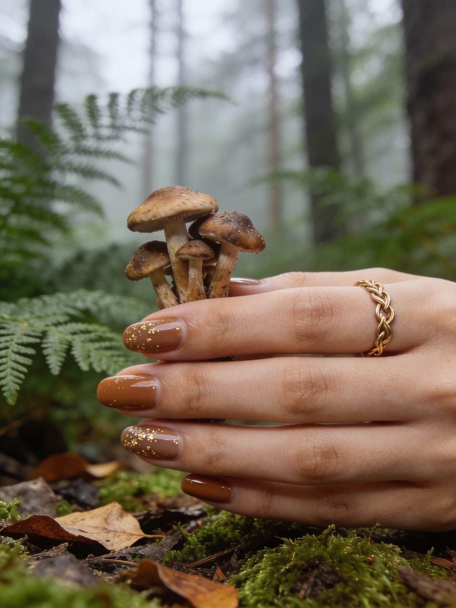 Macro close-up of a woman model’s hand gently holding a small cluster of forest mushrooms, nails in warm taupe gloss with tiny gold specks, simple vine-shaped gold ring, damp moss and leaf litter visible, blurred ferns and tree trunks behind, soft overcast forest light, ultra-HD 4K fashion editorial photography, razor-sharp focus, extreme detail, modern luxury styling, clean composition, high dynamic range, crisp textures, premium magazine quality, contemporary fashion aesthetic, no grain, no blur, no vintage.