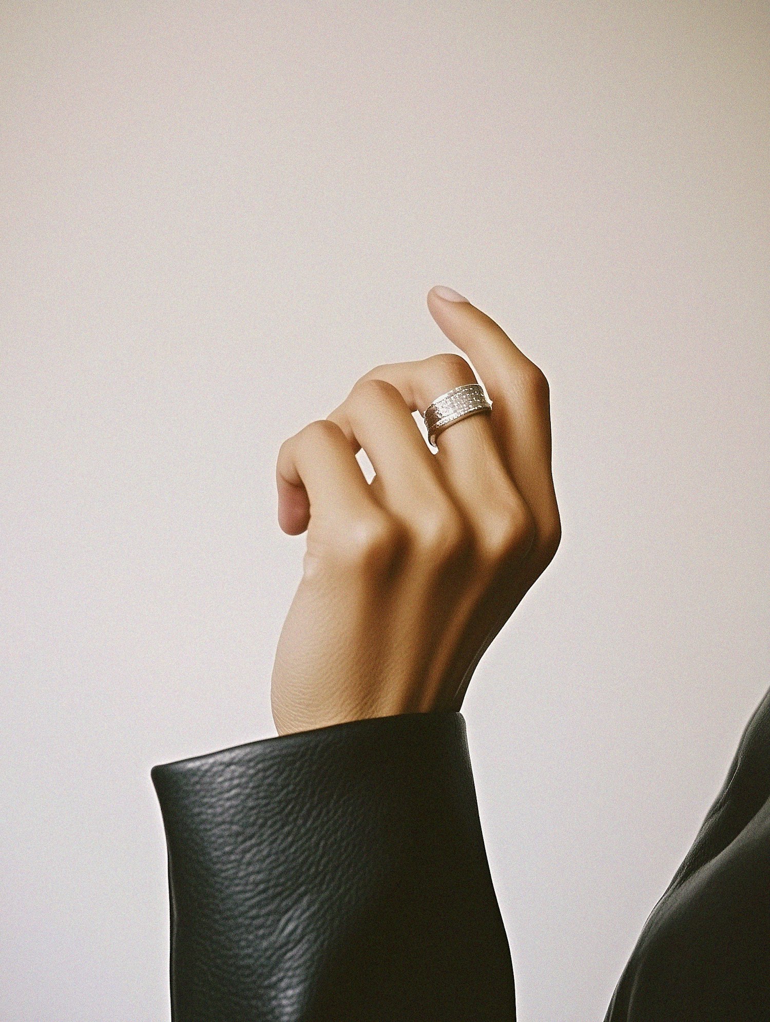 Close-up of a hand wearing a silver ring with sparkling stones, paired with a black leather jacket sleeve against a neutral background.