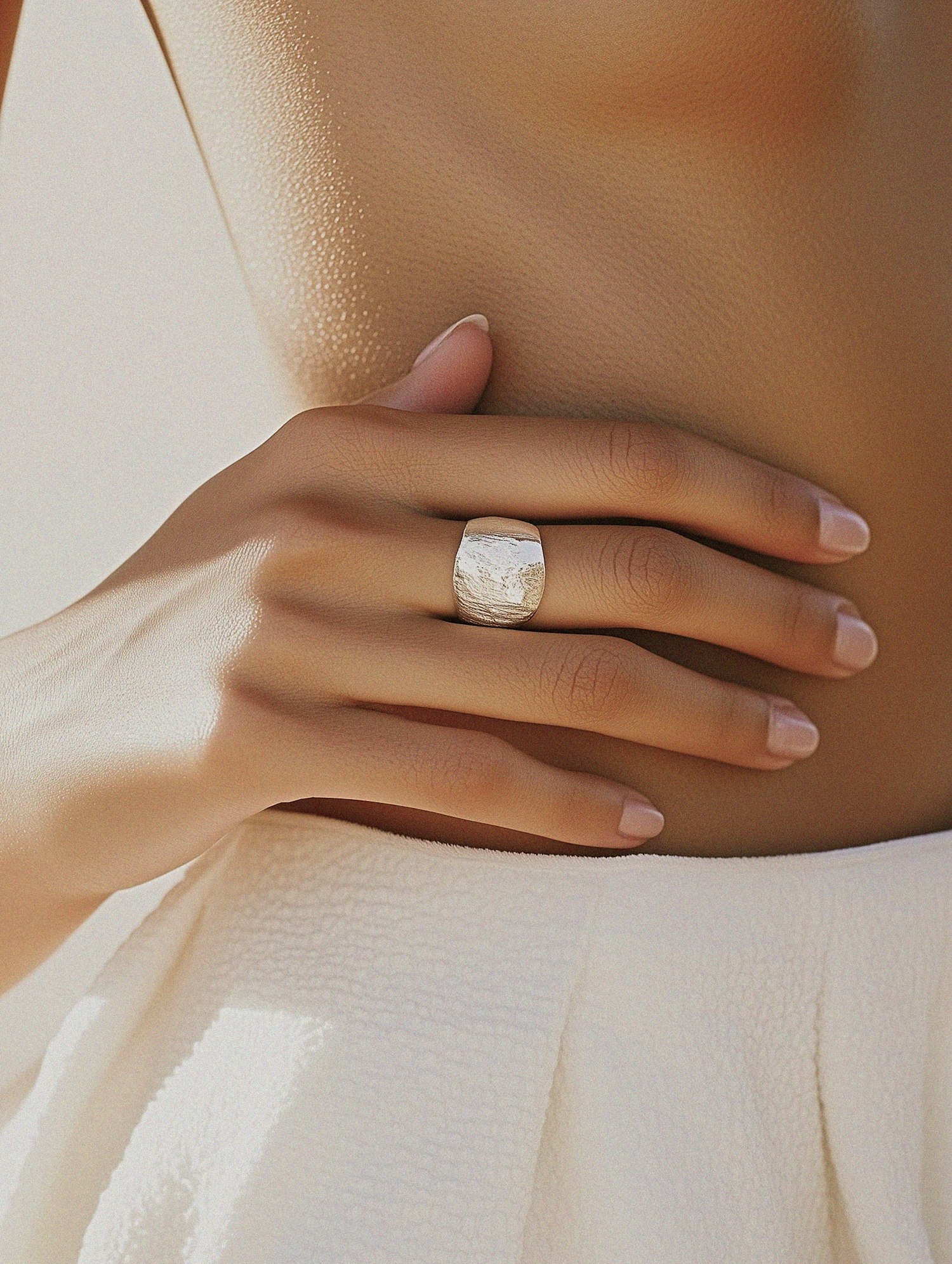 Elegant hand with a silver ring against a bare torso, showcasing smooth skin and manicured nails in soft lighting.