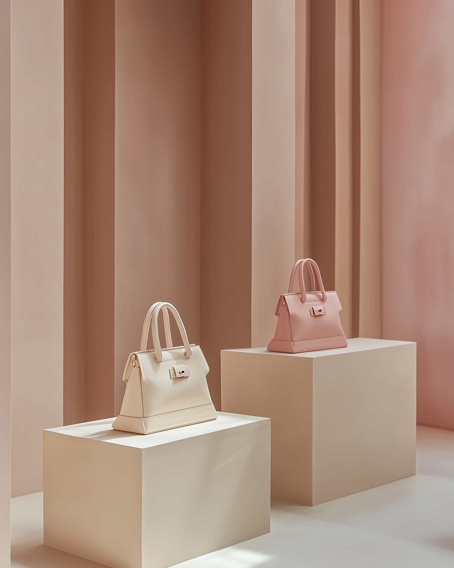 Two luxury handbags in beige and blush pink displayed on pedestals in a minimalist, softly lit setting with neutral tones.