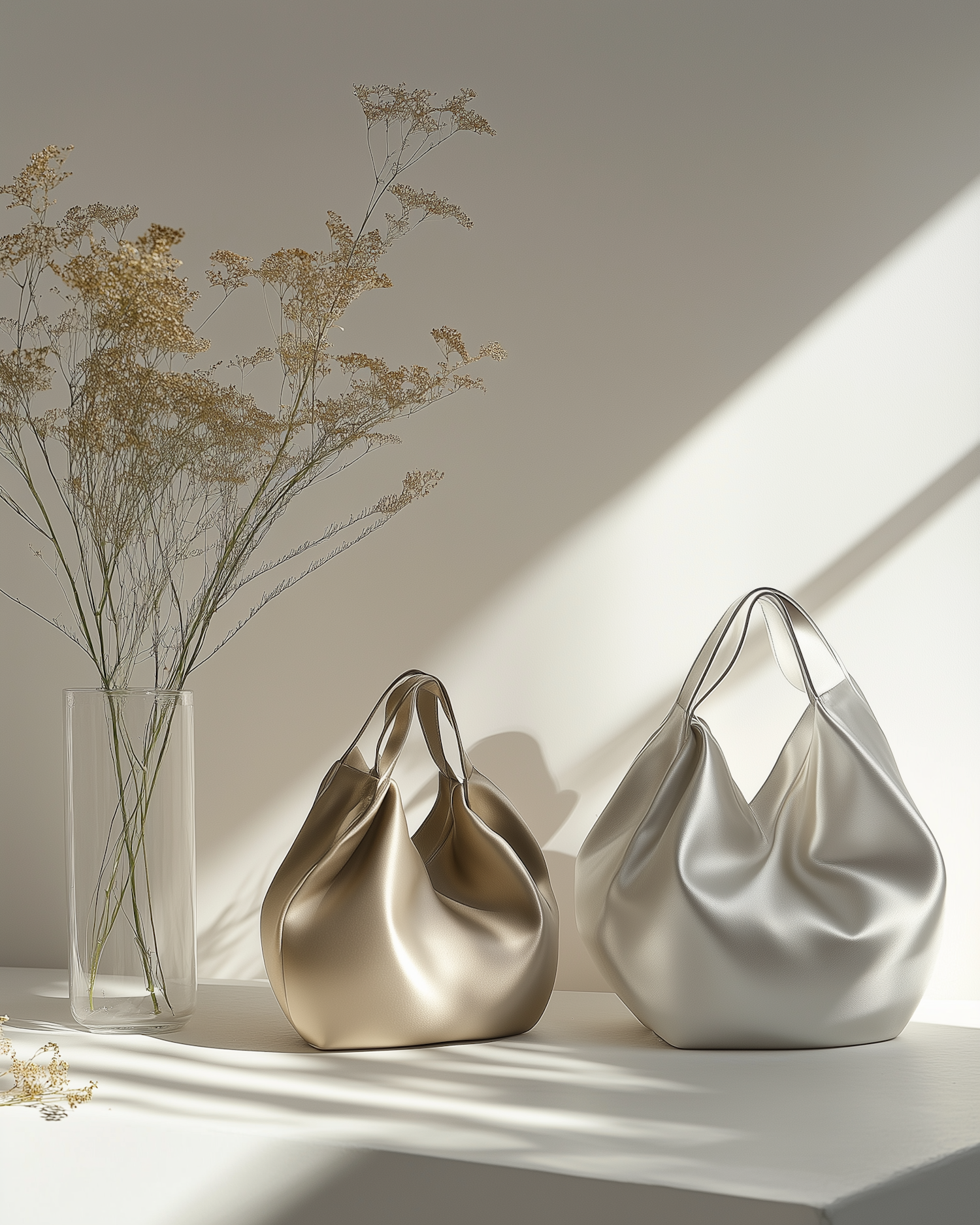 Minimalist display of gold and white handbags with dried flowers in soft natural light, perfect for a chic and elegant aesthetic.