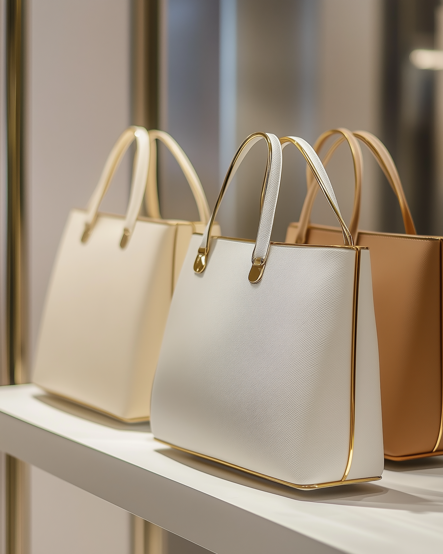 Elegant cream, white, and beige handbags with gold accents displayed on a sleek white shelf in a luxury retail setting.