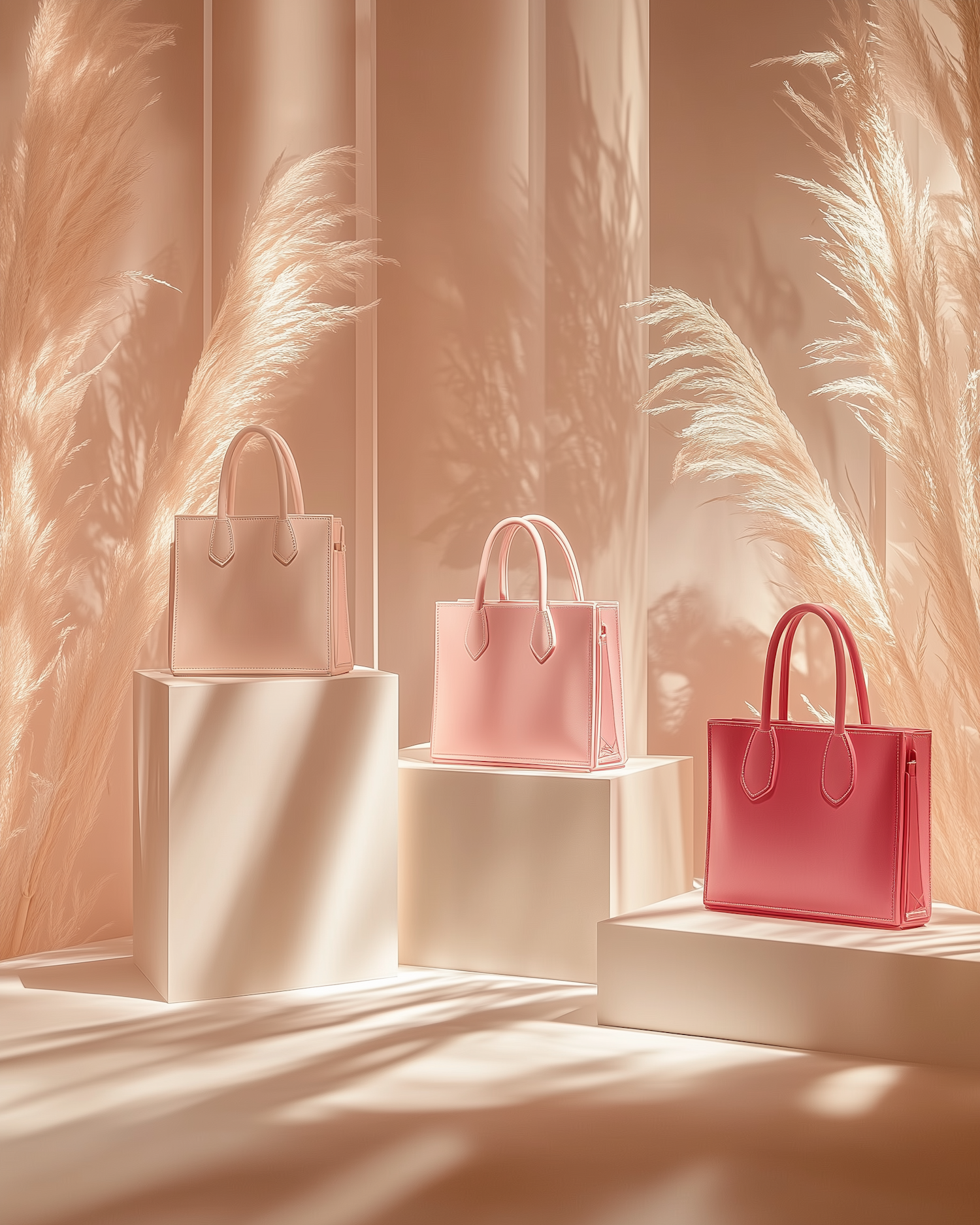 Chic handbags in beige, pink, and red on minimalist podiums with pampas grass and soft lighting for a luxurious vibe.