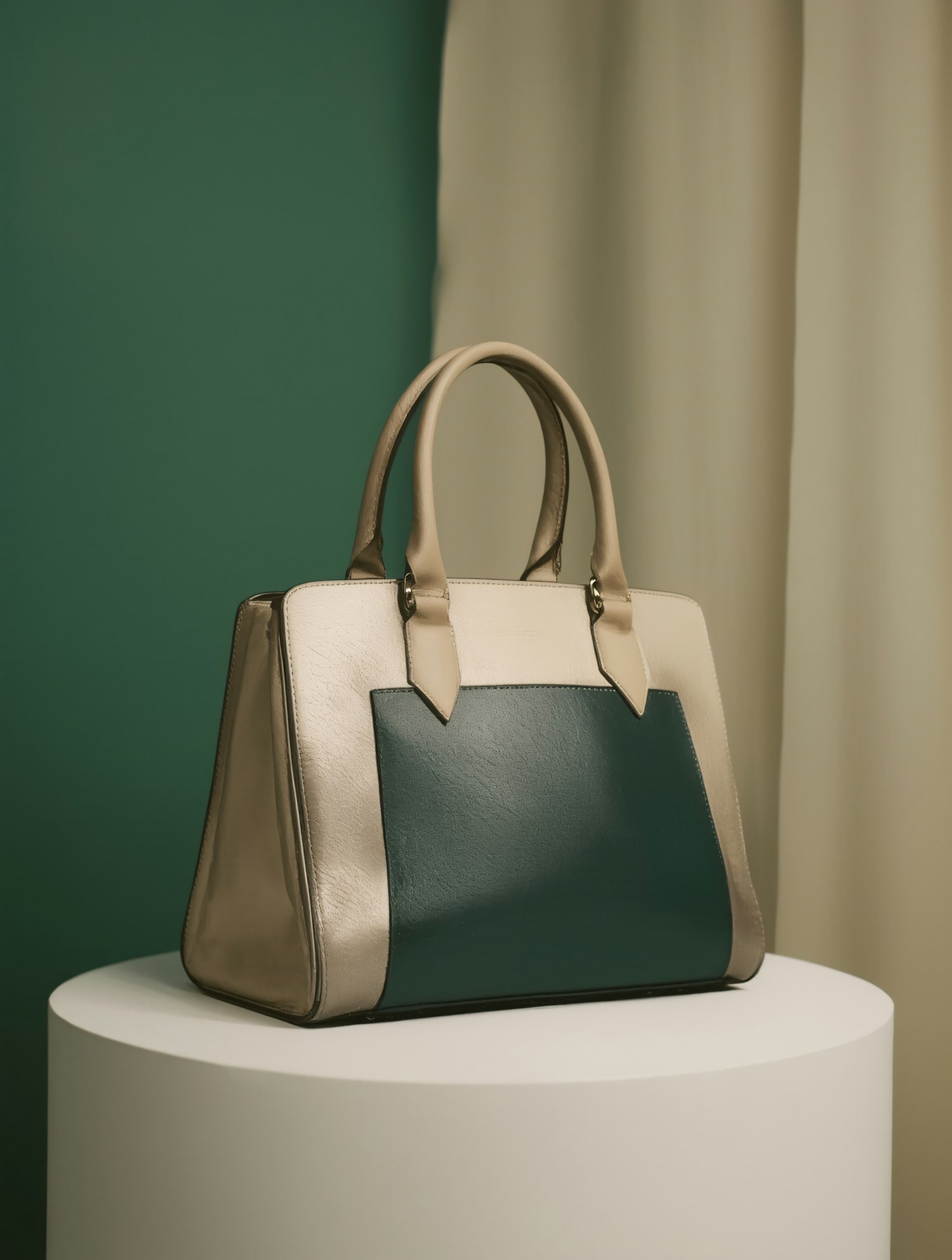 Elegant two-tone handbag with green and beige leather, displayed on a white pedestal against a chic green and beige backdrop.