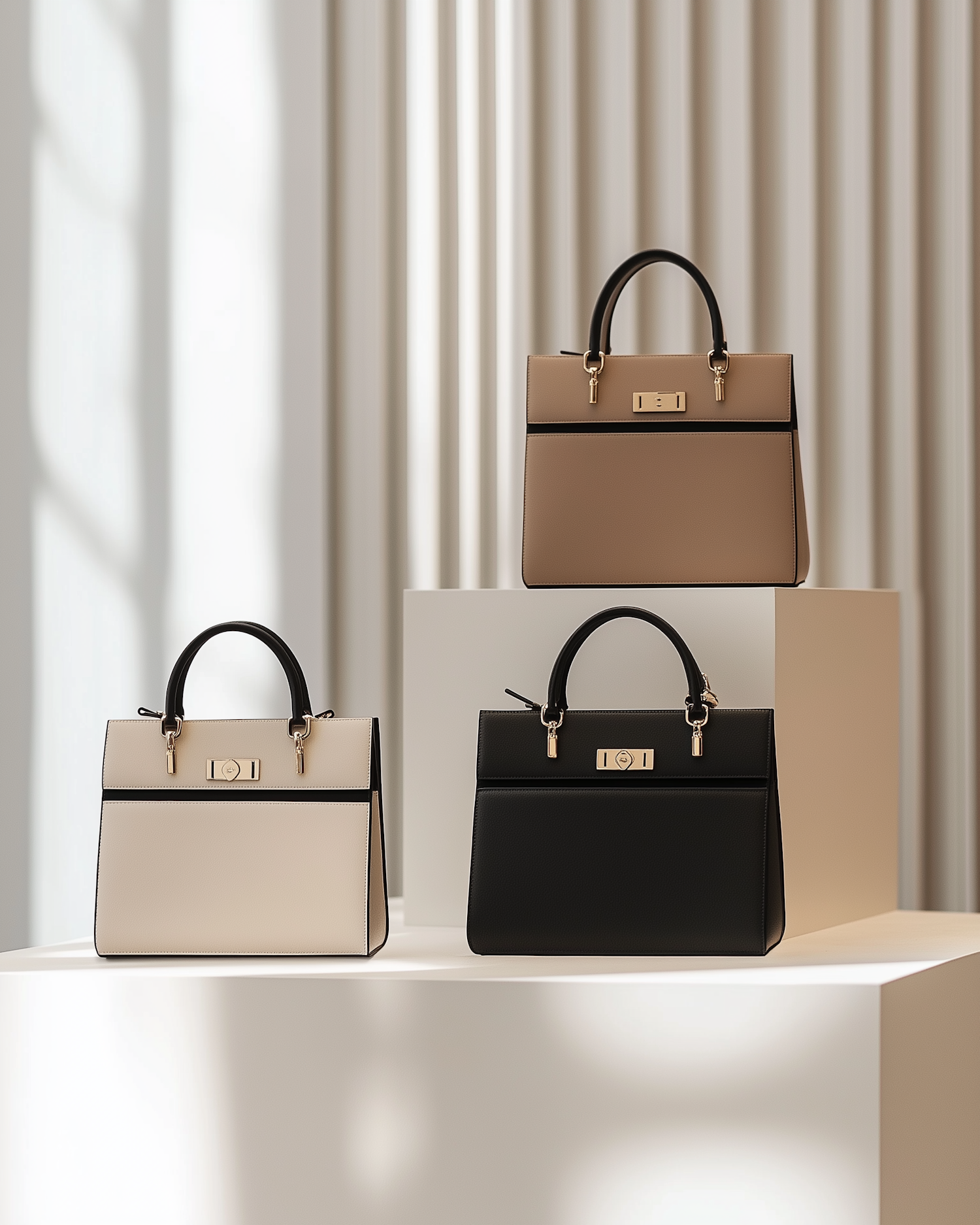 Three luxury handbags in beige, cream, and black with gold accents displayed on pedestals in a minimalist, softly lit setting.