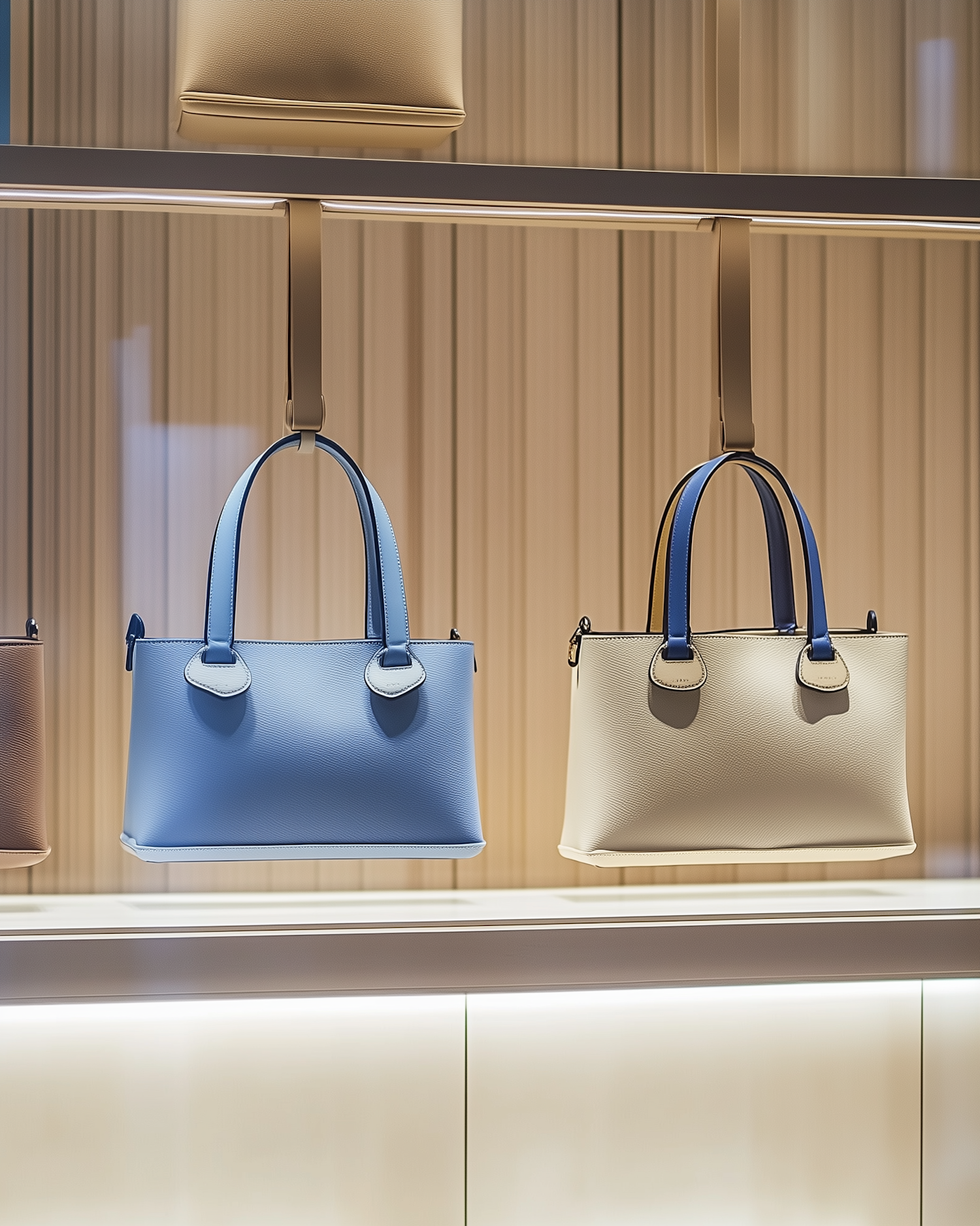 Stylish pastel blue and beige handbags on a sleek, illuminated display shelf with a neutral beige backdrop. Perfect for modern fashion lovers.