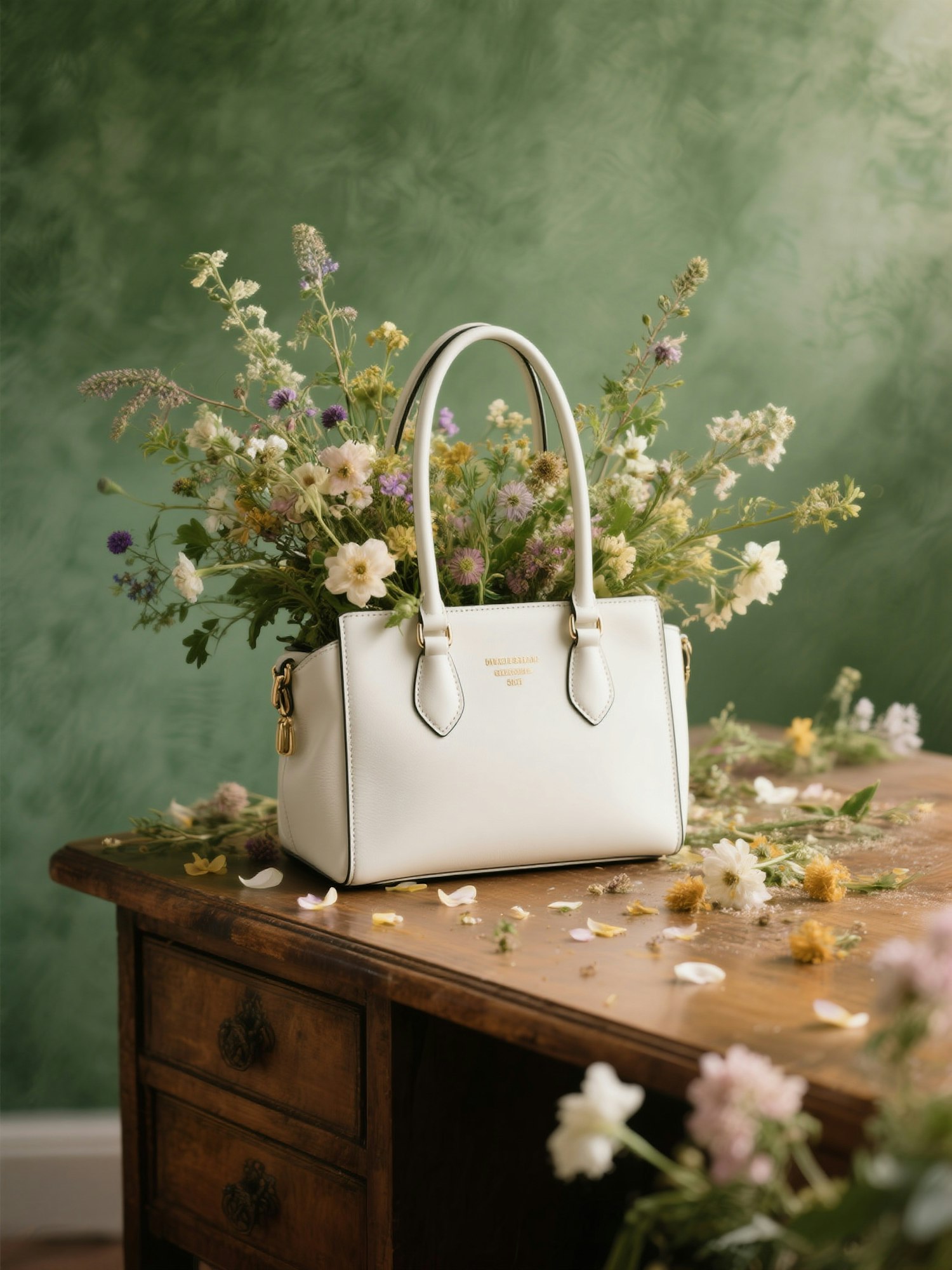 Elegant white handbag on a wooden desk surrounded by wildflowers and petals, set against a soft green textured background.