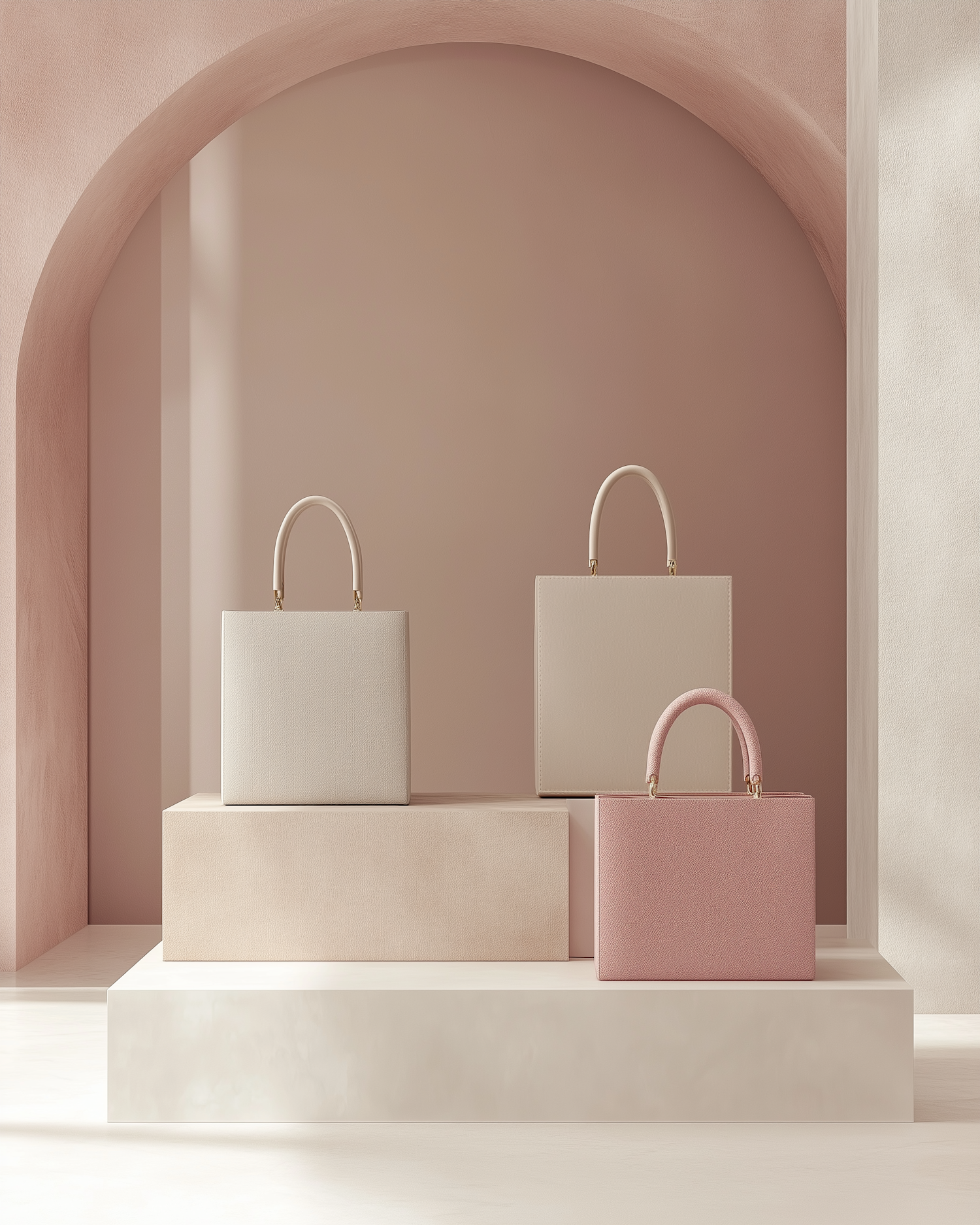Minimalist display of three structured handbags in beige and pink tones, set against a pastel arched backdrop with soft lighting.