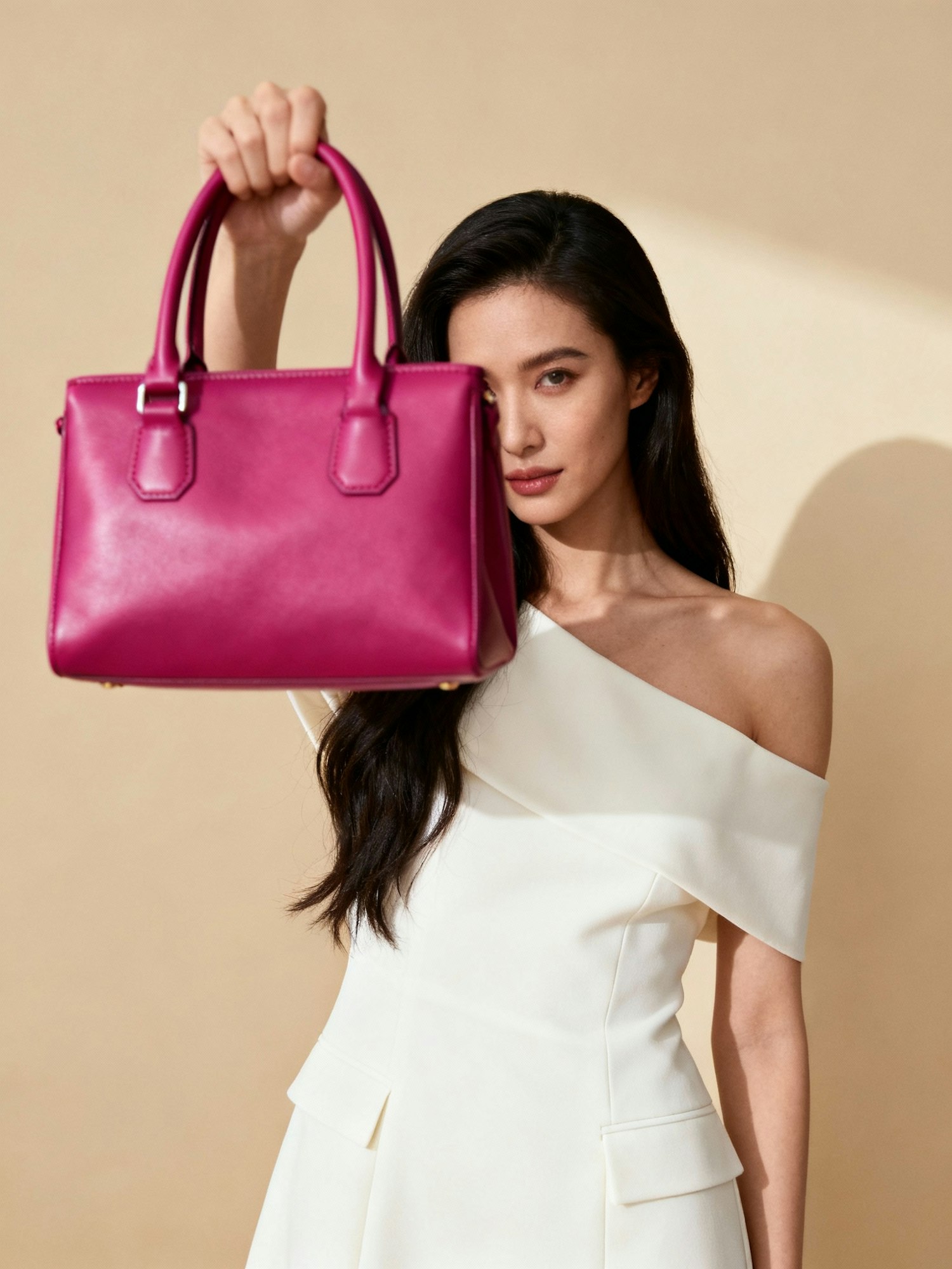 high-end fashion editorial photo, minimal photo studio with smooth warm beige solid backdrop, clean and airy composition, soft natural lighting with subtle shadows, sharp focus, realistic textures, luxurious yet effortless atmosphere, refined styling, professional fashion photography, consistent minimal studio setup, photorealistic — model holding a bright magenta leather handbag in front of her face, only showing her long dark hair and bare shoulders, wearing a structured white off-shoulder dress, minimal composition