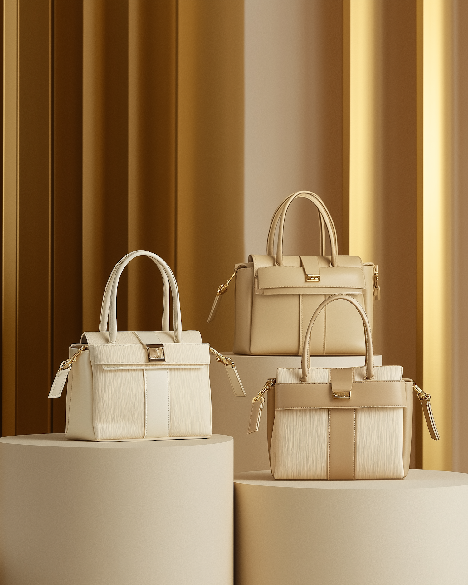 Three cream and beige handbags with gold accents on pedestals, set against a golden backdrop for a luxurious, elegant display.