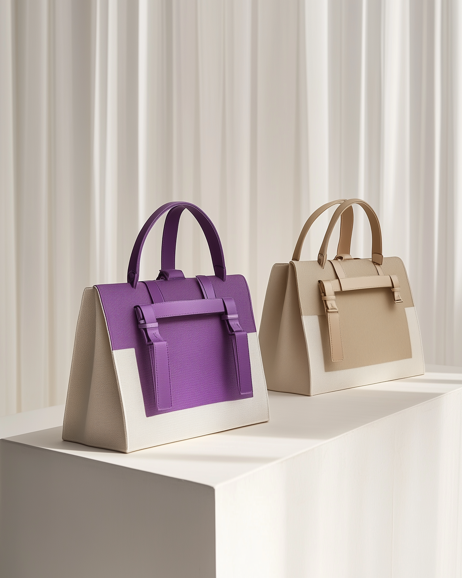 Two stylish handbags in purple and beige with white bases, displayed on a minimalist pedestal against soft white curtains.