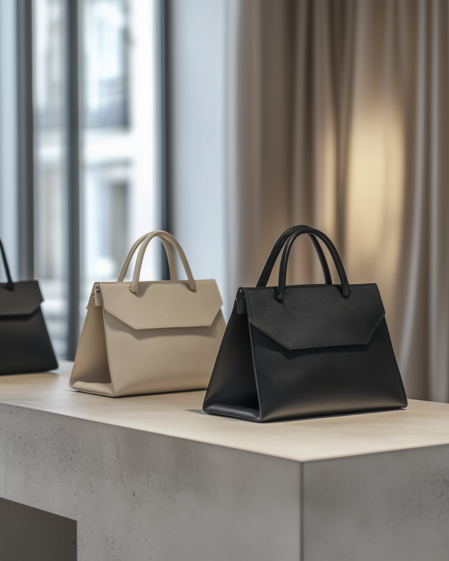 Elegant black and beige handbags displayed on a wooden surface in a modern, minimalistic setting with soft natural lighting.