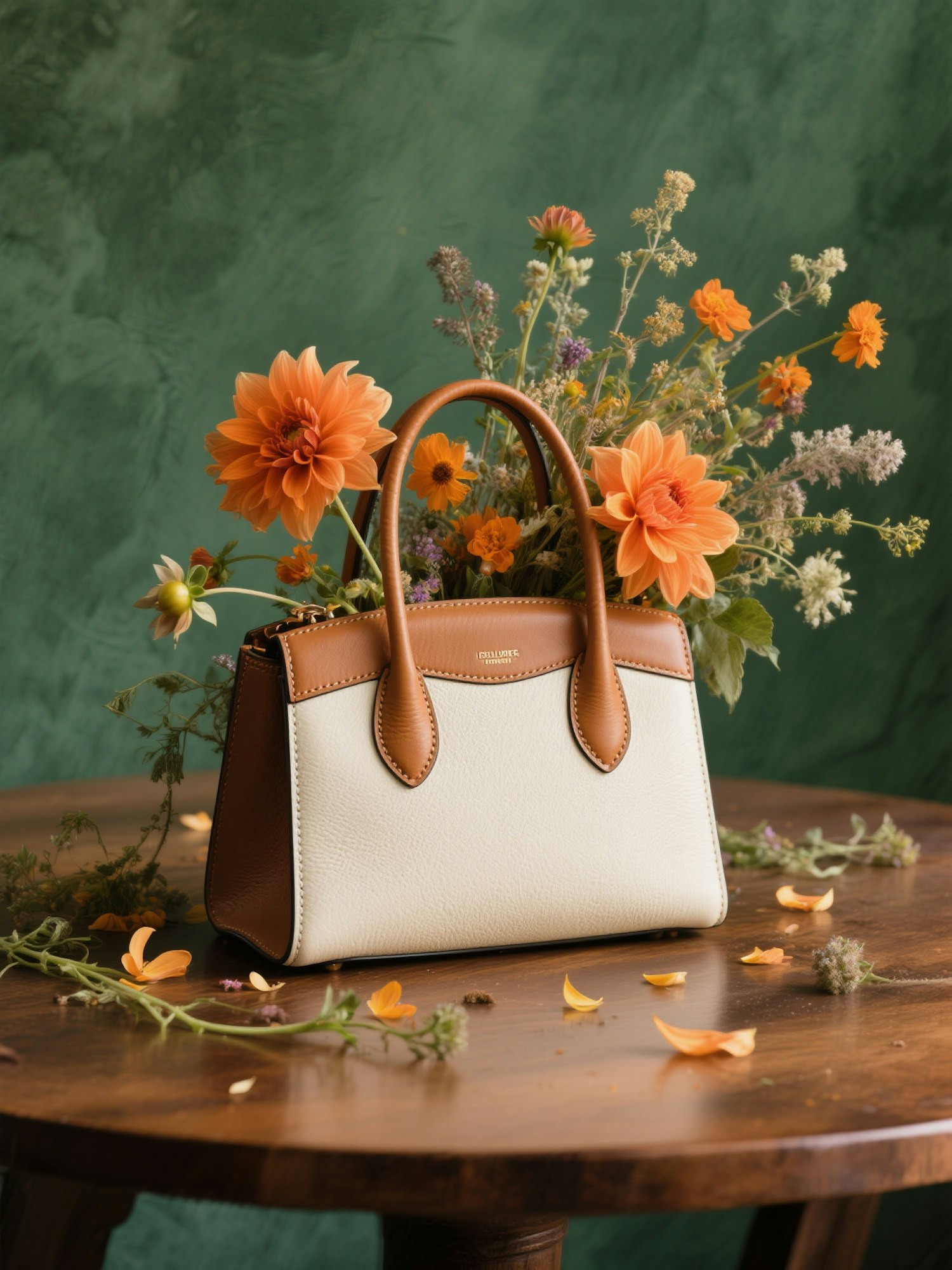 studio product photography of a handbag staged like a luxury fashion campaign, elegant floral composition, soft natural lighting, vintage still life setup, warm tones, flowers coming out of or surrounding the bag, green textured background, editorial style, 50mm lens, medium shot + a two-tone structured handbag placed on a wooden table, orange dahlias and wildflowers arranged inside the bag