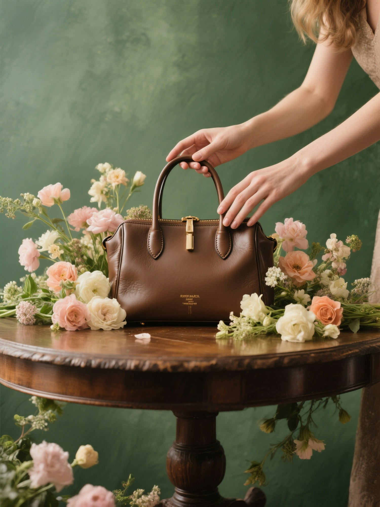 studio product photography of a handbag staged like a luxury fashion campaign, elegant floral composition, soft natural lighting, vintage still life setup, warm tones, flowers coming out of or surrounding the bag, green textured background, editorial style, 50mm lens, medium shot + a woman placing a handbag on a vintage table, her hands surrounded by freshly cut garden flowers
