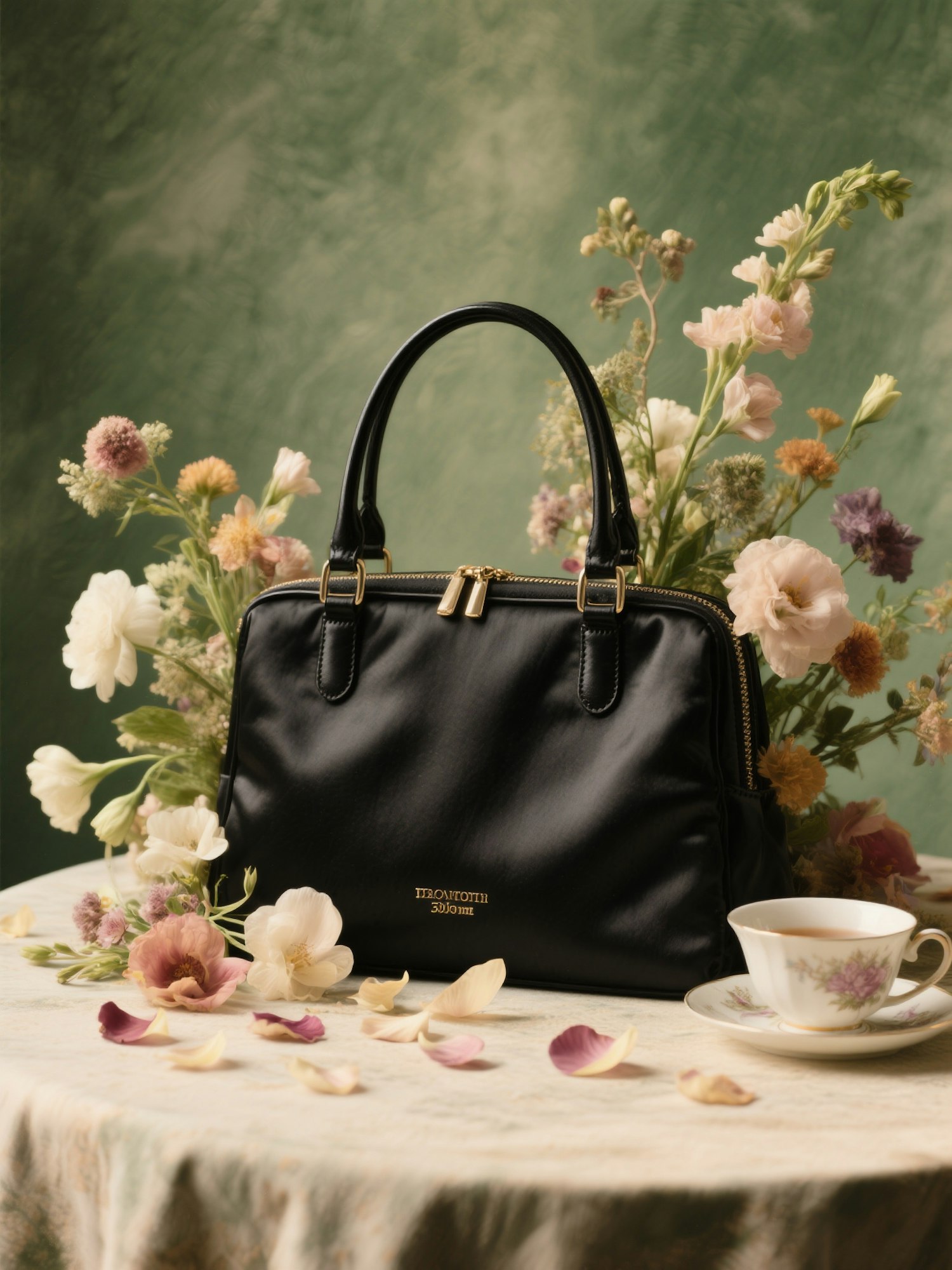 studio product photography of a handbag staged like a luxury fashion campaign, elegant floral composition, soft natural lighting, vintage still life setup, warm tones, flowers coming out of or surrounding the bag, green textured background, editorial style, 50mm lens, medium shot + a rectangular black satin bag placed on a table, next to a tea cup and loose petals
