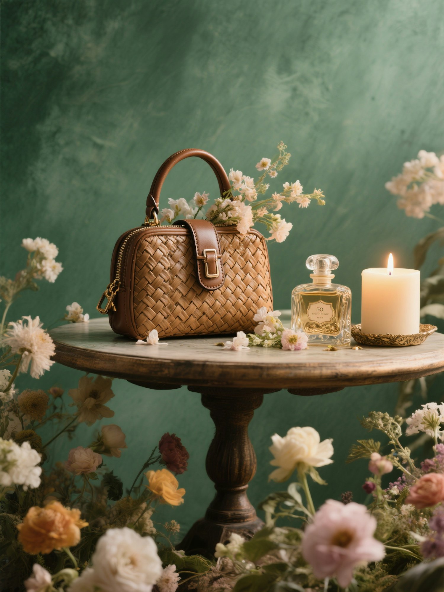 studio product photography of a handbag staged like a luxury fashion campaign, elegant floral composition, soft natural lighting, vintage still life setup, warm tones, flowers coming out of or surrounding the bag, green textured background, editorial style, 50mm lens, medium shot + a woven leather mini bag placed next to a candle and vintage perfume bottle, flowers falling out of the bag