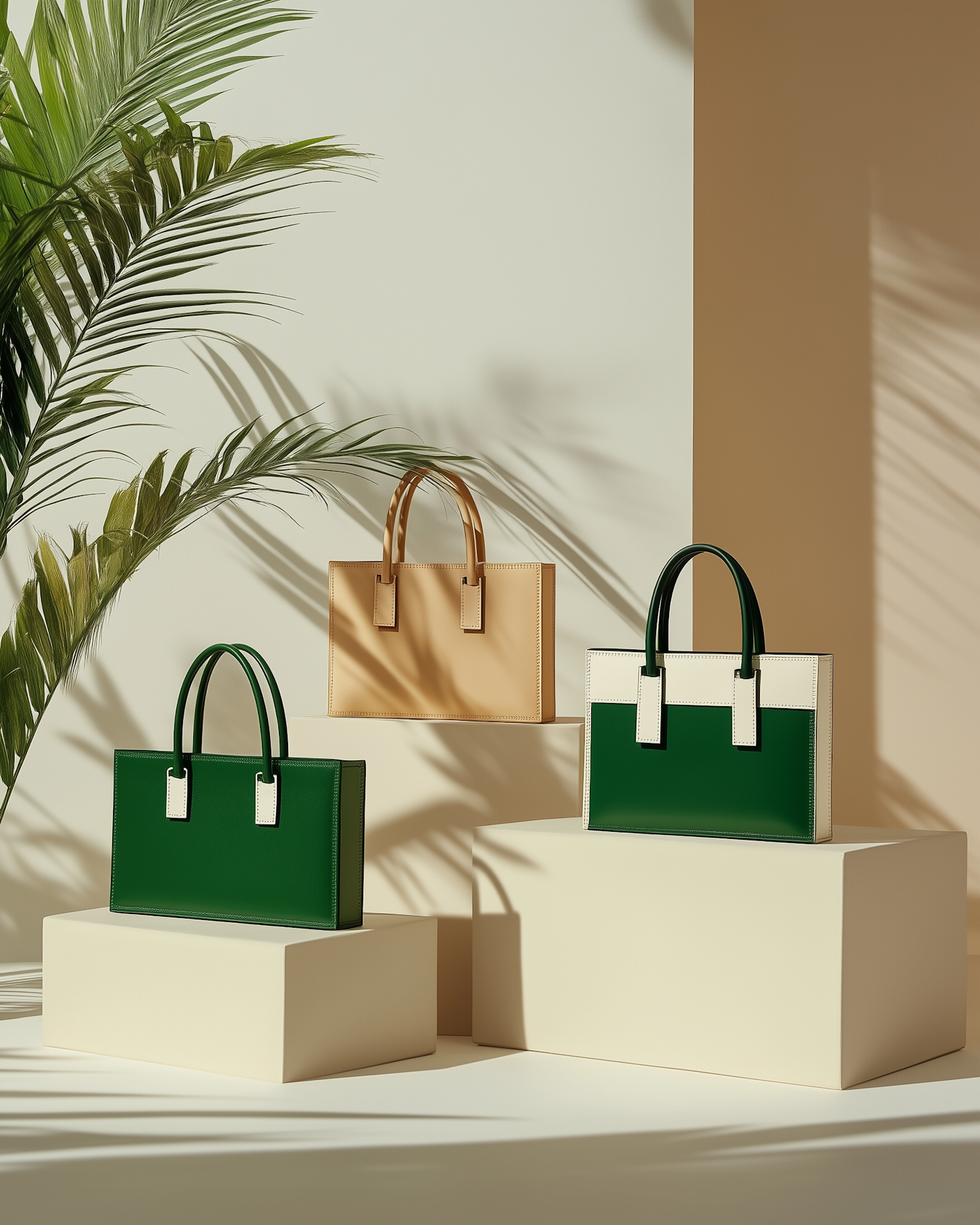 Minimalist display of green and beige handbags on pedestals with soft lighting and tropical palm accents for a chic, modern vibe.
