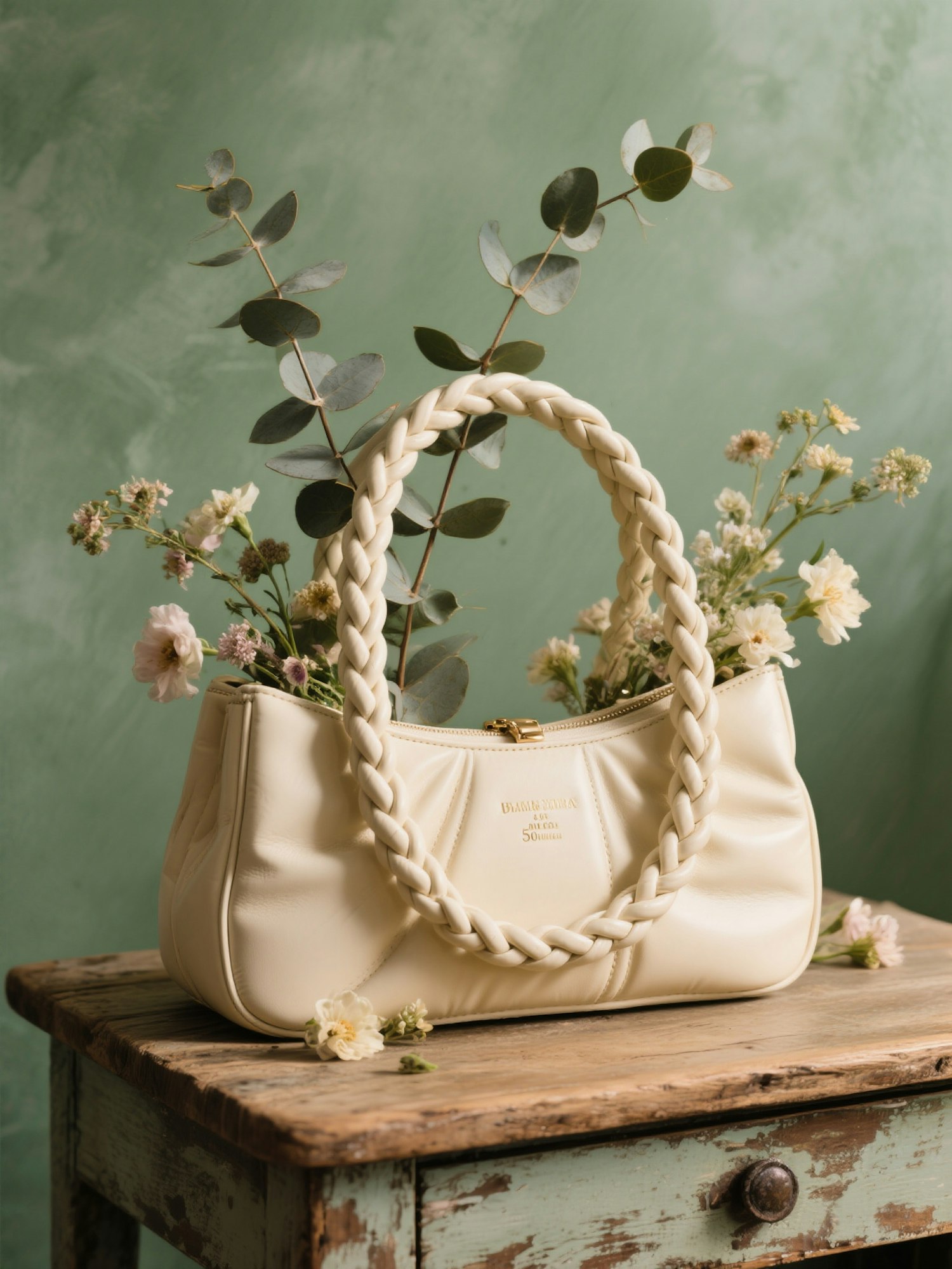 Elegant cream handbag with braided handle, styled with flowers and eucalyptus on a rustic table against a soft green background.