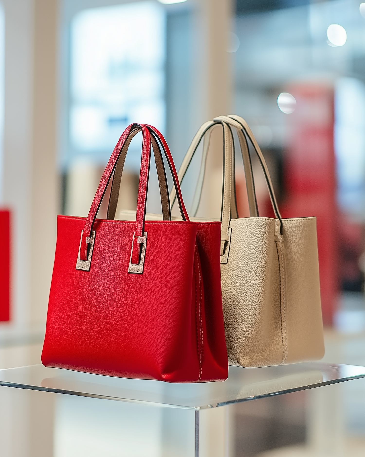 Stylish red and beige handbags on display in a chic retail setting, showcasing premium leather and elegant design details.