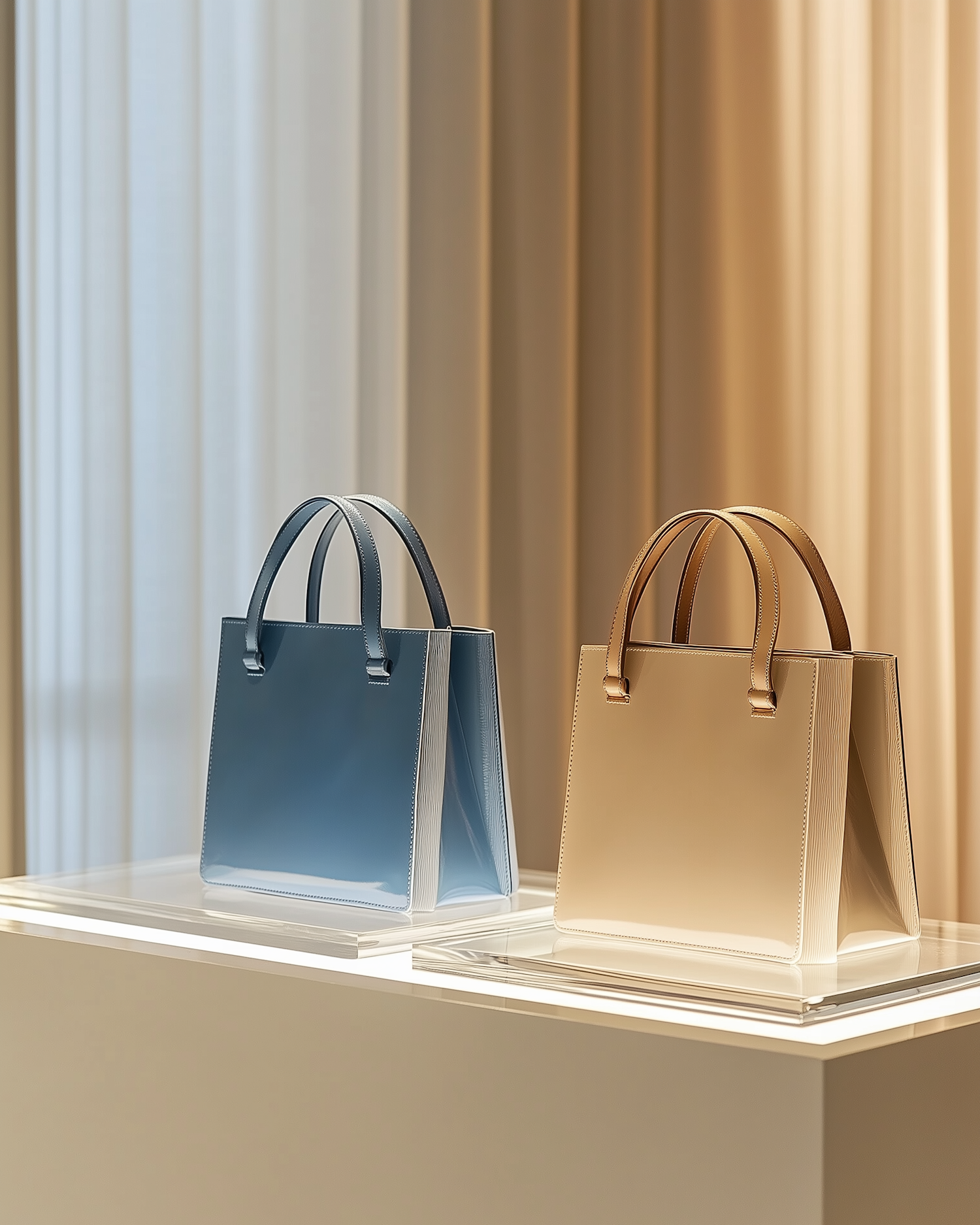 Minimalist blue and beige handbags on display with glossy finishes, set against a neutral-toned curtain backdrop for a chic aesthetic.