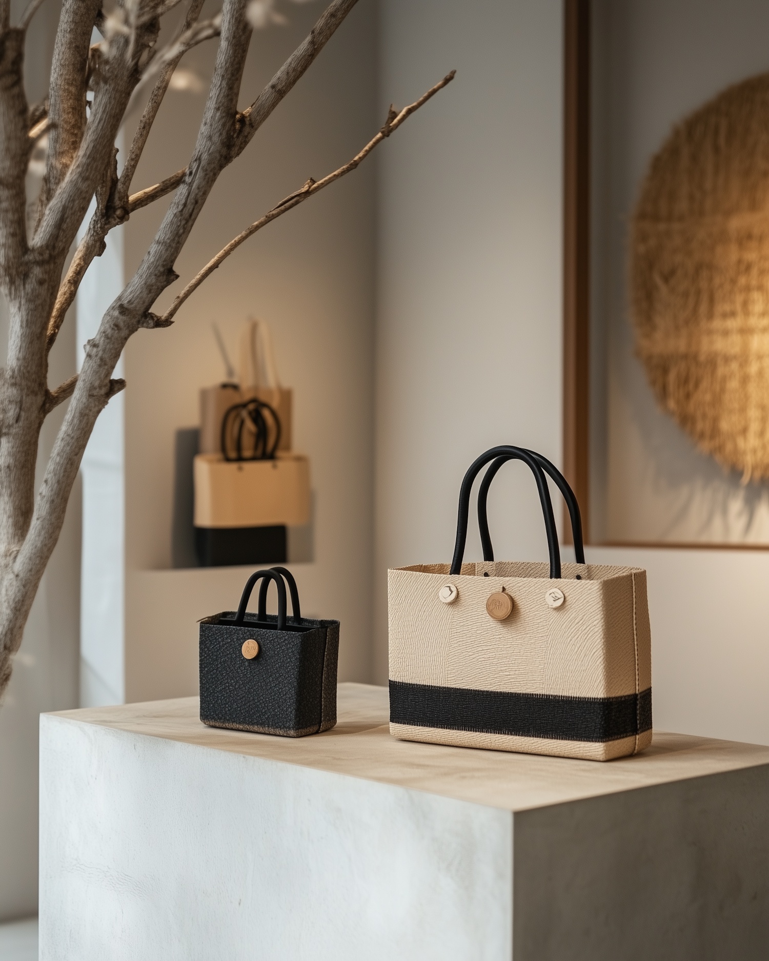 Minimalist display of beige and black handbags on a wooden pedestal, with natural decor and soft lighting enhancing the elegant design.
