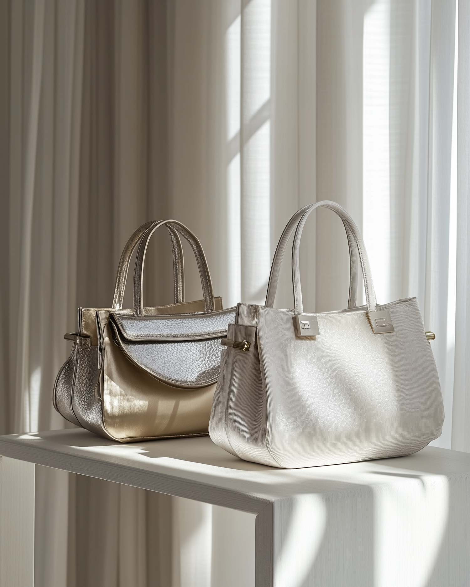 Two luxury handbags, one gold and one white, displayed on a white table with soft natural light and elegant curtain backdrop.