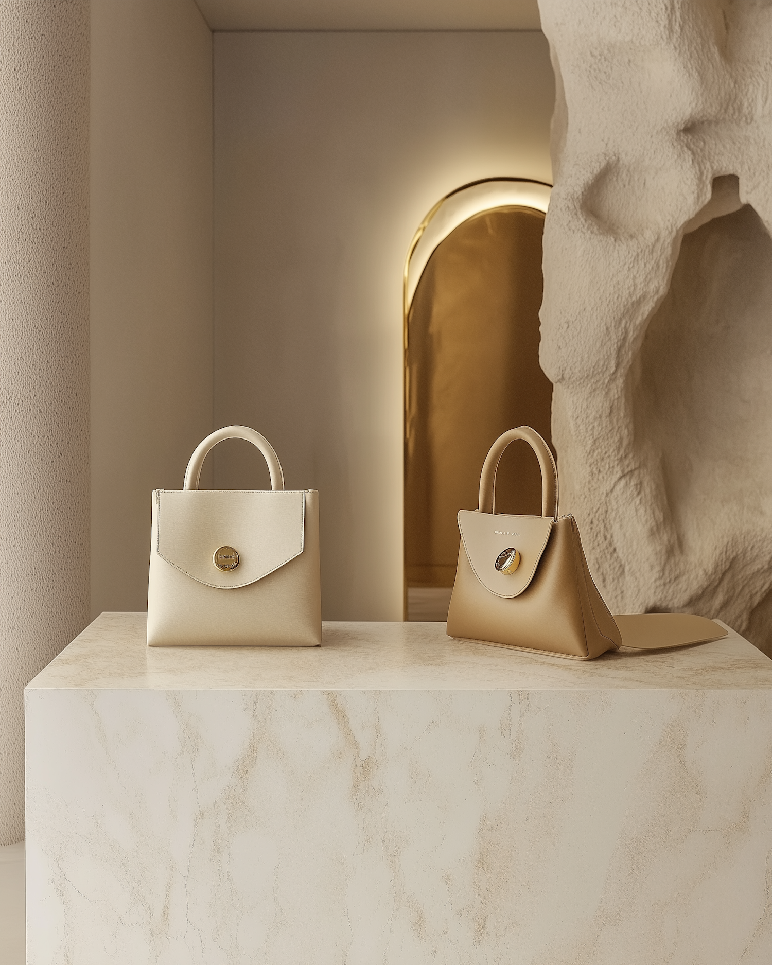 Minimalist display of cream and beige handbags with gold accents on a marble pedestal, set against a sculptural and golden-lit background.