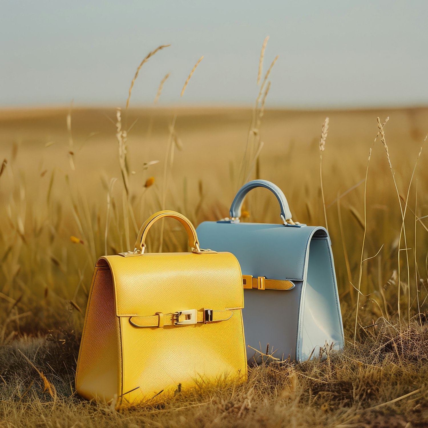 Stylish yellow and blue handbags in a sunlit grassy field, showcasing elegant design and vibrant colors.