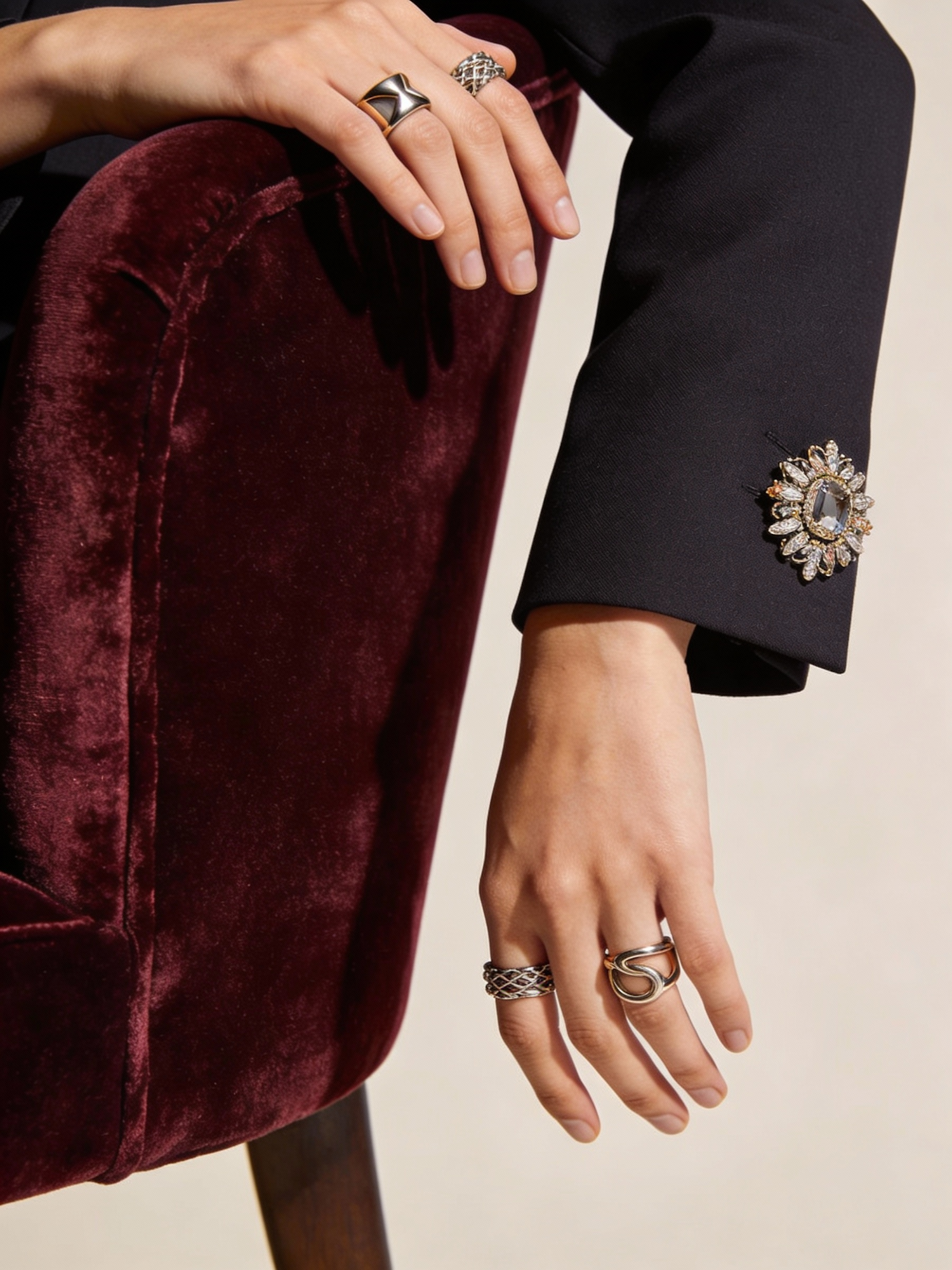 Close-up of hands with elegant rings resting on a burgundy velvet chair, paired with a black jacket featuring a decorative brooch.