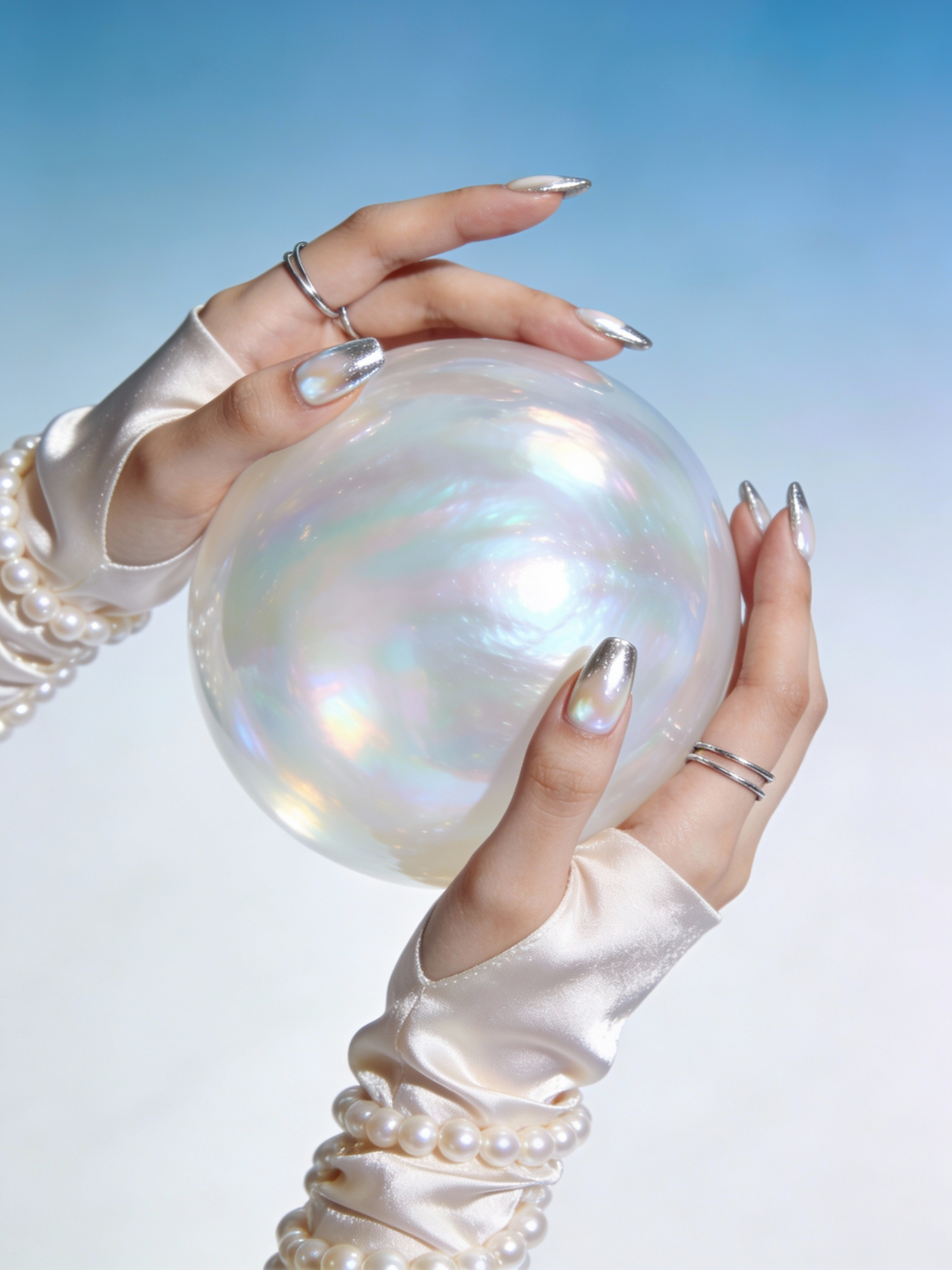 Elegant hands with silver nails and pearl bracelets hold a glowing iridescent sphere against a soft blue gradient background.