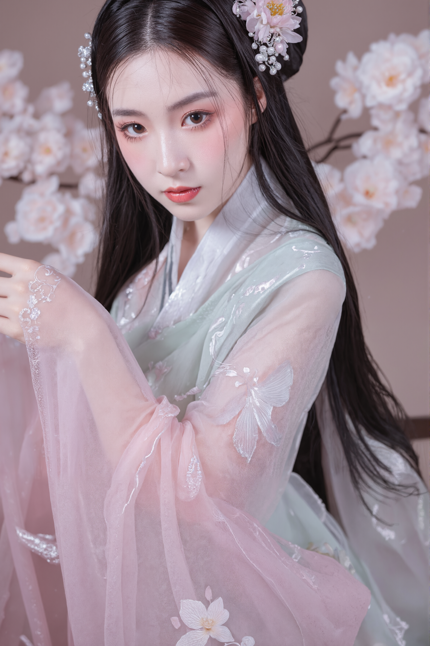 A woman in a pastel hanfu with floral embroidery and delicate hair accessories poses gracefully with cherry blossoms in the background.