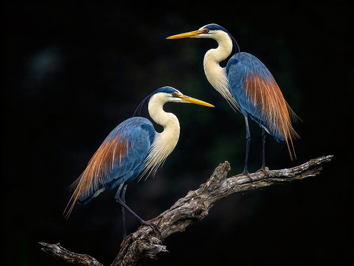 Two vibrant herons perched on a branch, showcasing their striking blue and orange plumage against a dark background.