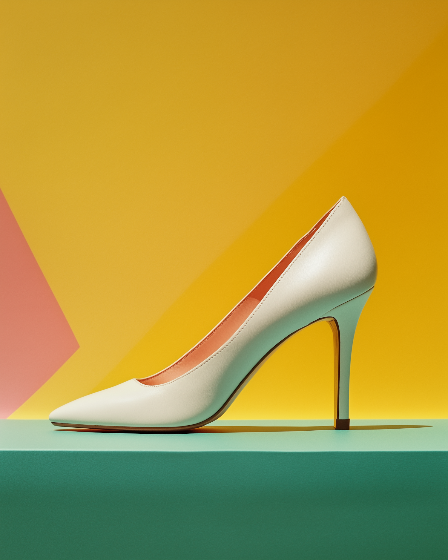 Elegant cream high-heeled shoe on a vibrant geometric background, showcasing luxury and style with a minimalist design.
