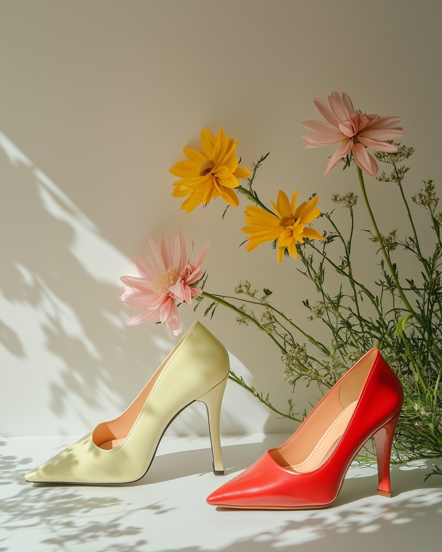 Elegant high heels in pale yellow and vibrant red with delicate pink and yellow flowers, creating a harmonious and stylish display.