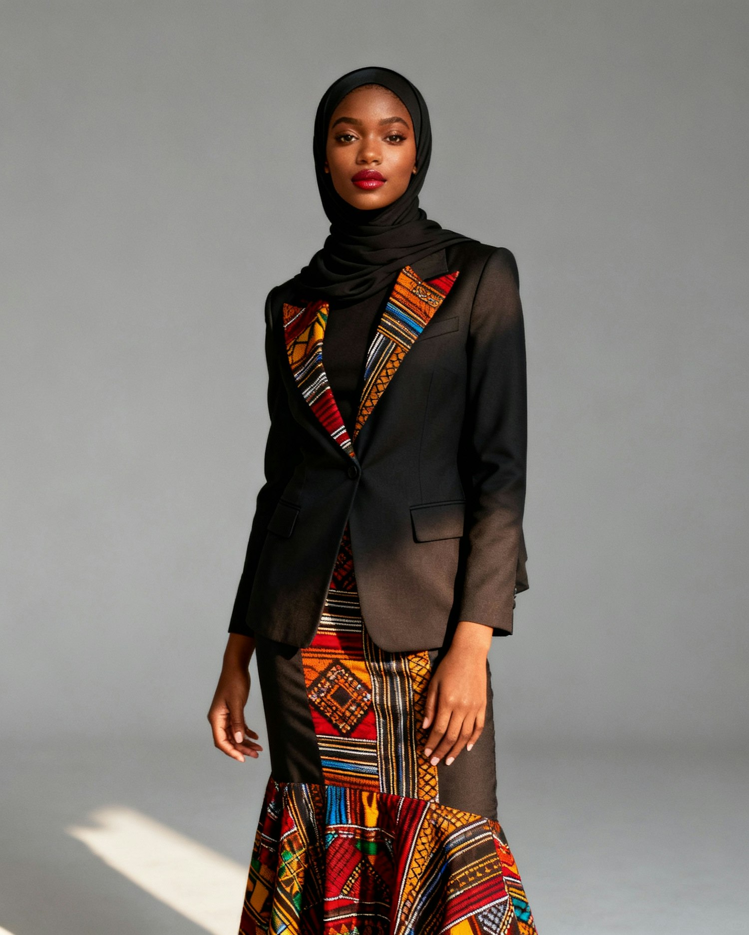 A woman in a black hijab and blazer with colorful patterns, paired with a matching skirt, stands confidently against a neutral background.