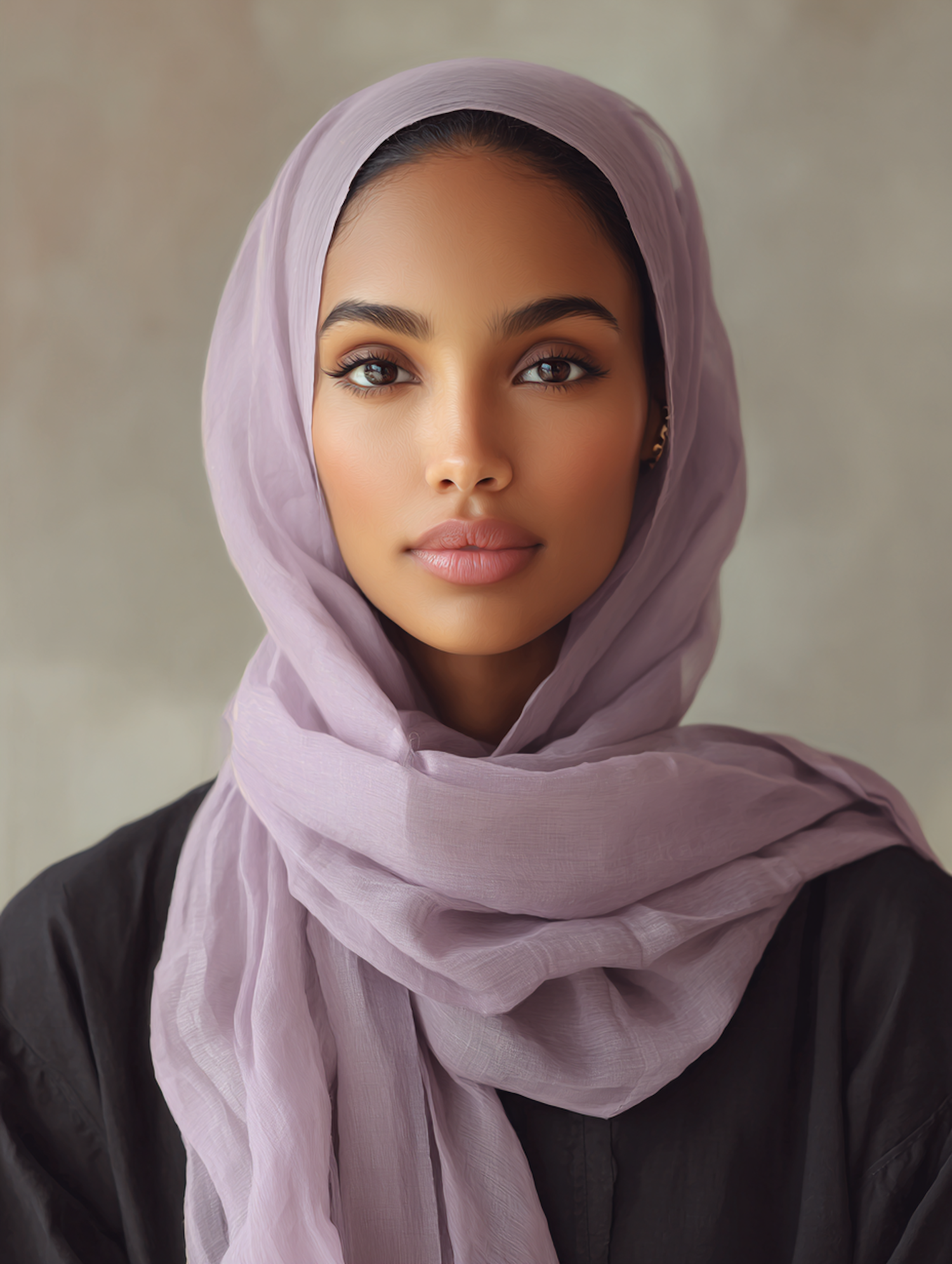 A serene portrait of a woman in a lavender hijab, showcasing her warm-toned skin and expressive eyes against a neutral background.