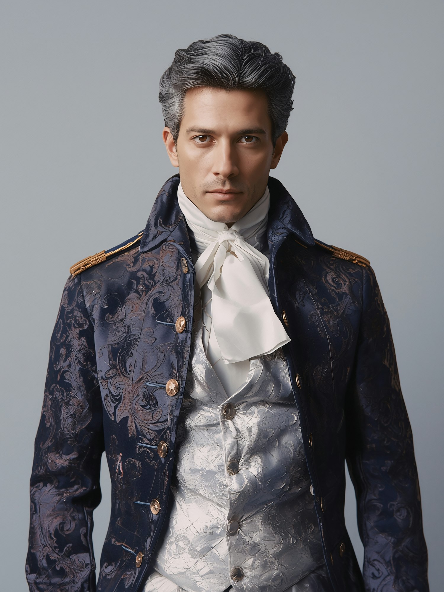 A man in a detailed, historical-style navy coat and silver waistcoat, with styled gray hair, stands against a neutral background.