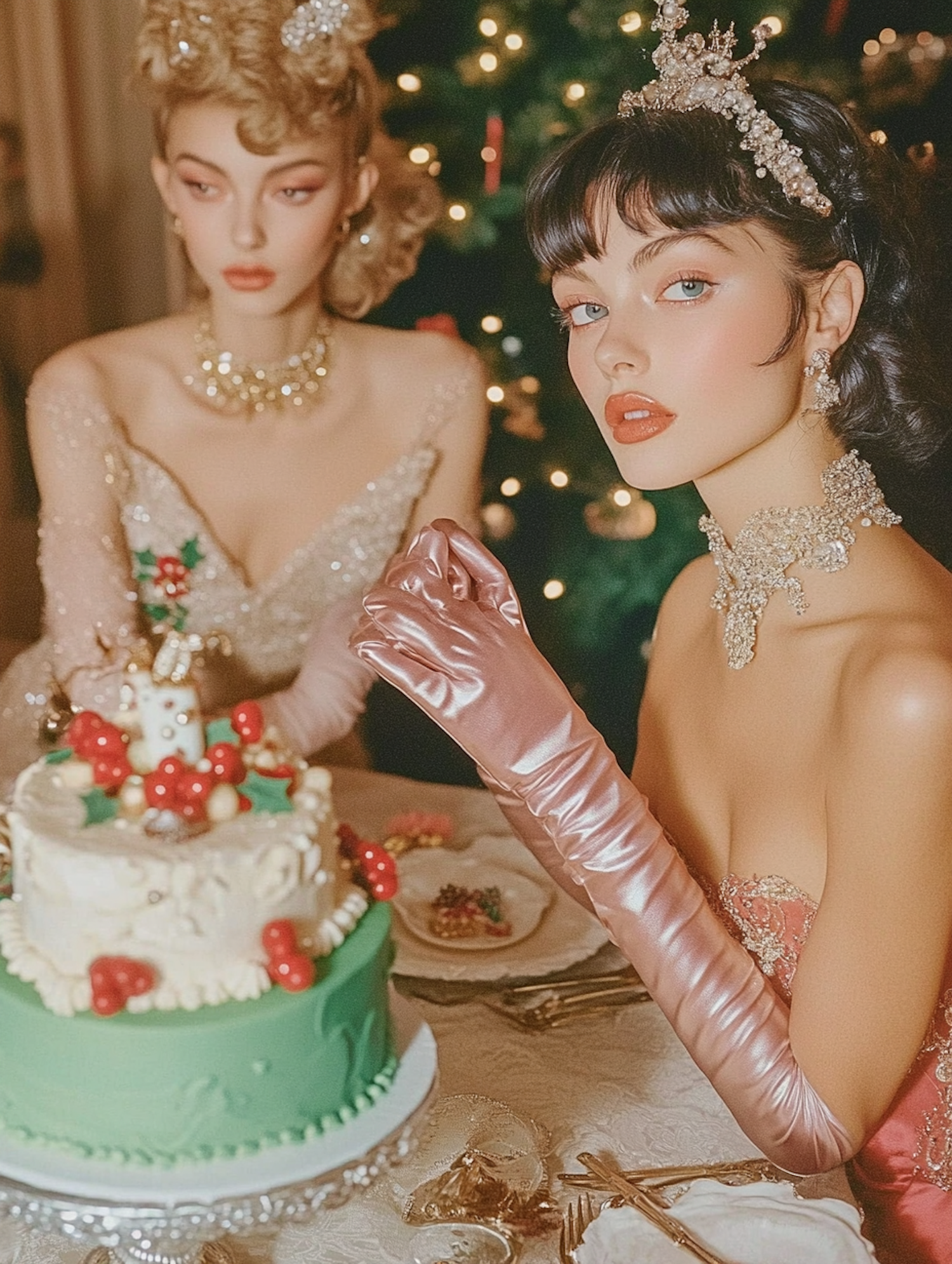 Two elegantly dressed women at a festive table with a decorated cake, set against a backdrop of a twinkling Christmas tree.
