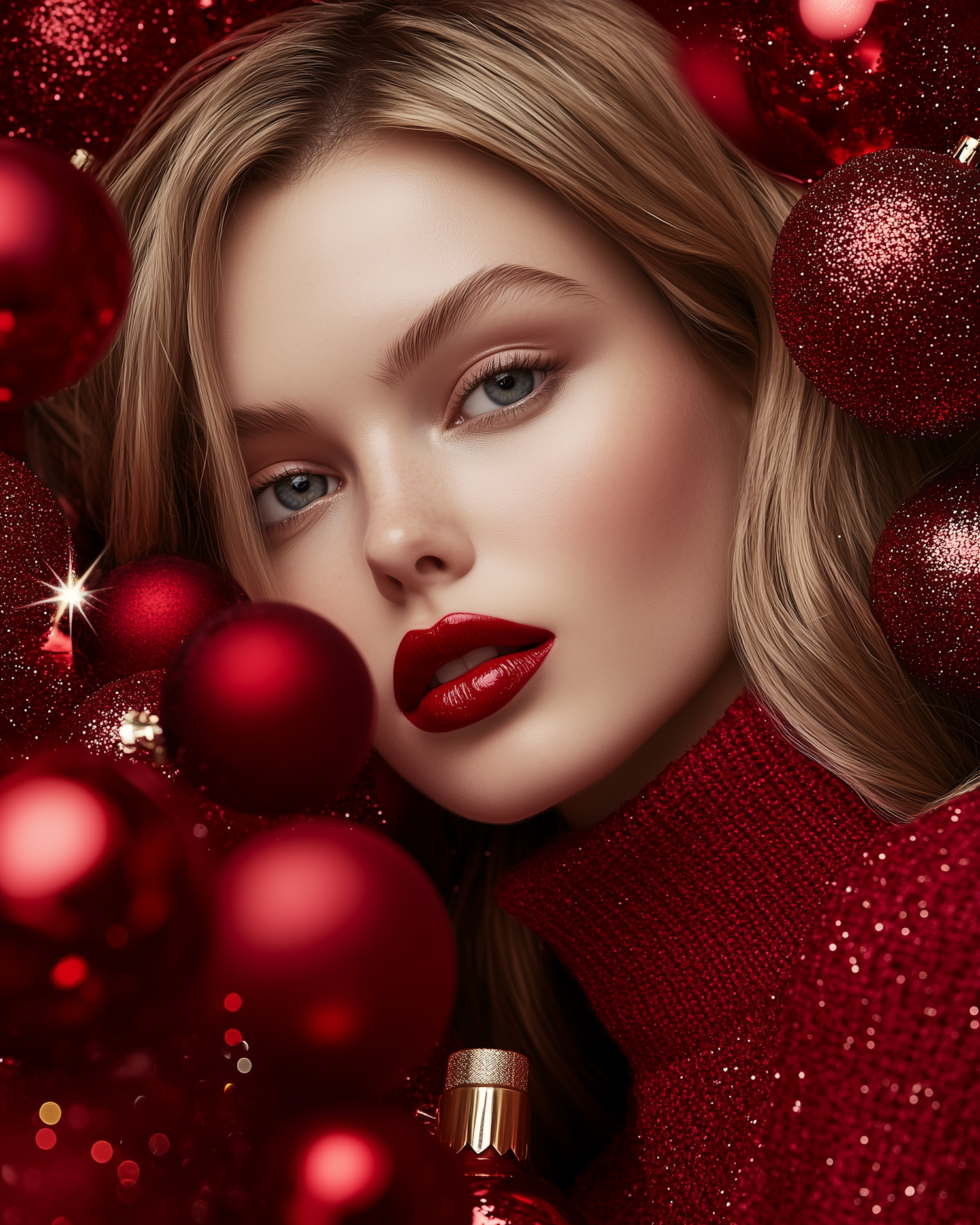 Festive close-up of a blonde woman with bold red lipstick, surrounded by glittering red Christmas ornaments and a sparkly sweater.