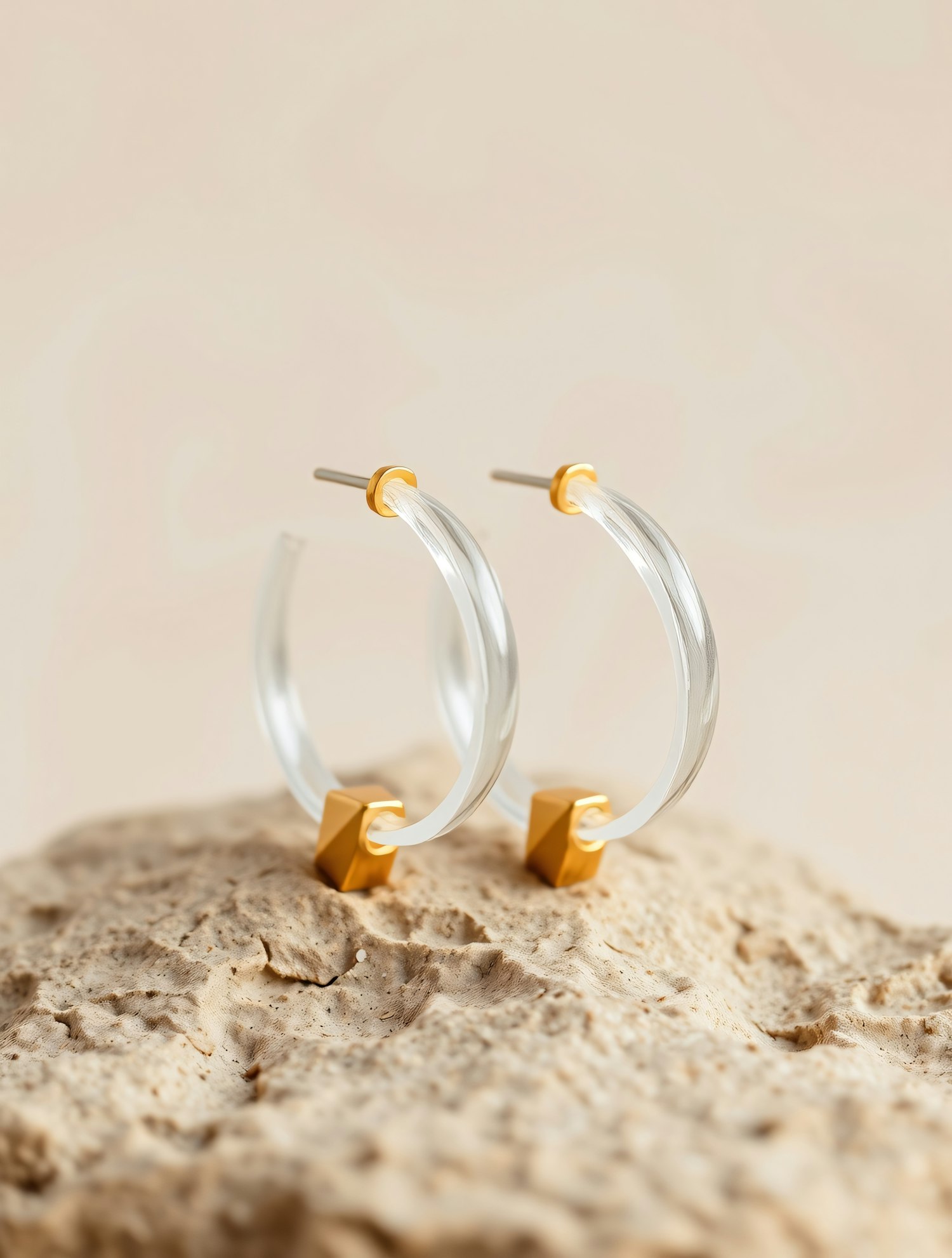 Elegant clear hoop earrings with gold accents on a textured stone surface, set against a soft beige background.