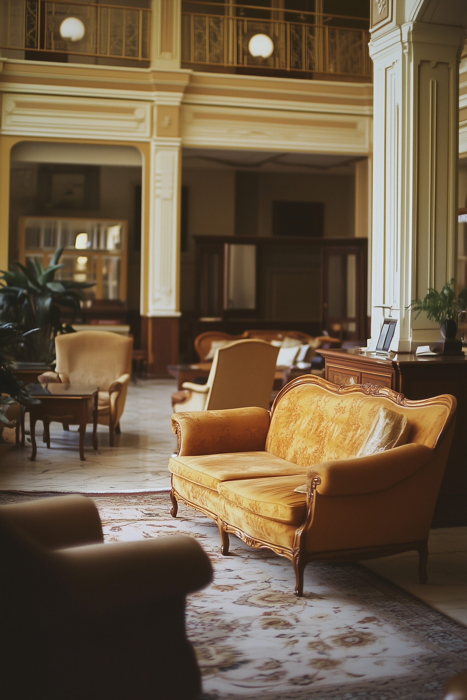 Elegant hotel lobby with vintage furniture, ornate columns, and warm lighting, creating a luxurious and inviting atmosphere.