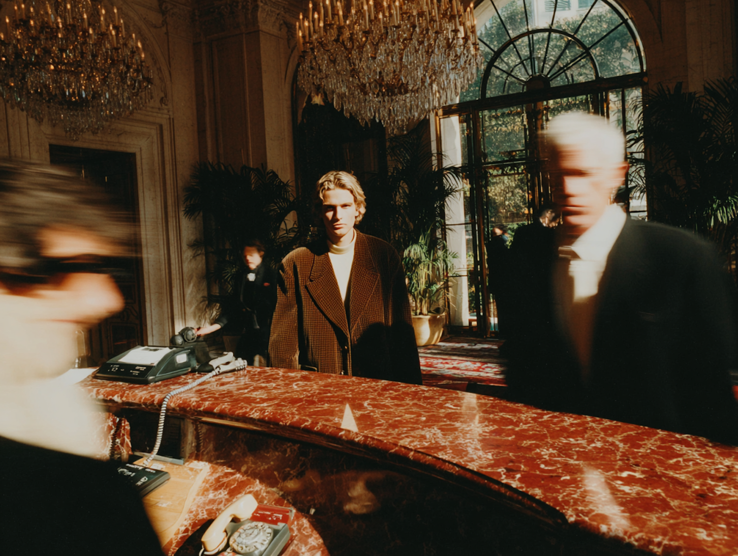 A luxurious hotel lobby with a red marble desk, chandeliers, and a man in a brown coat illuminated by sunlight.
