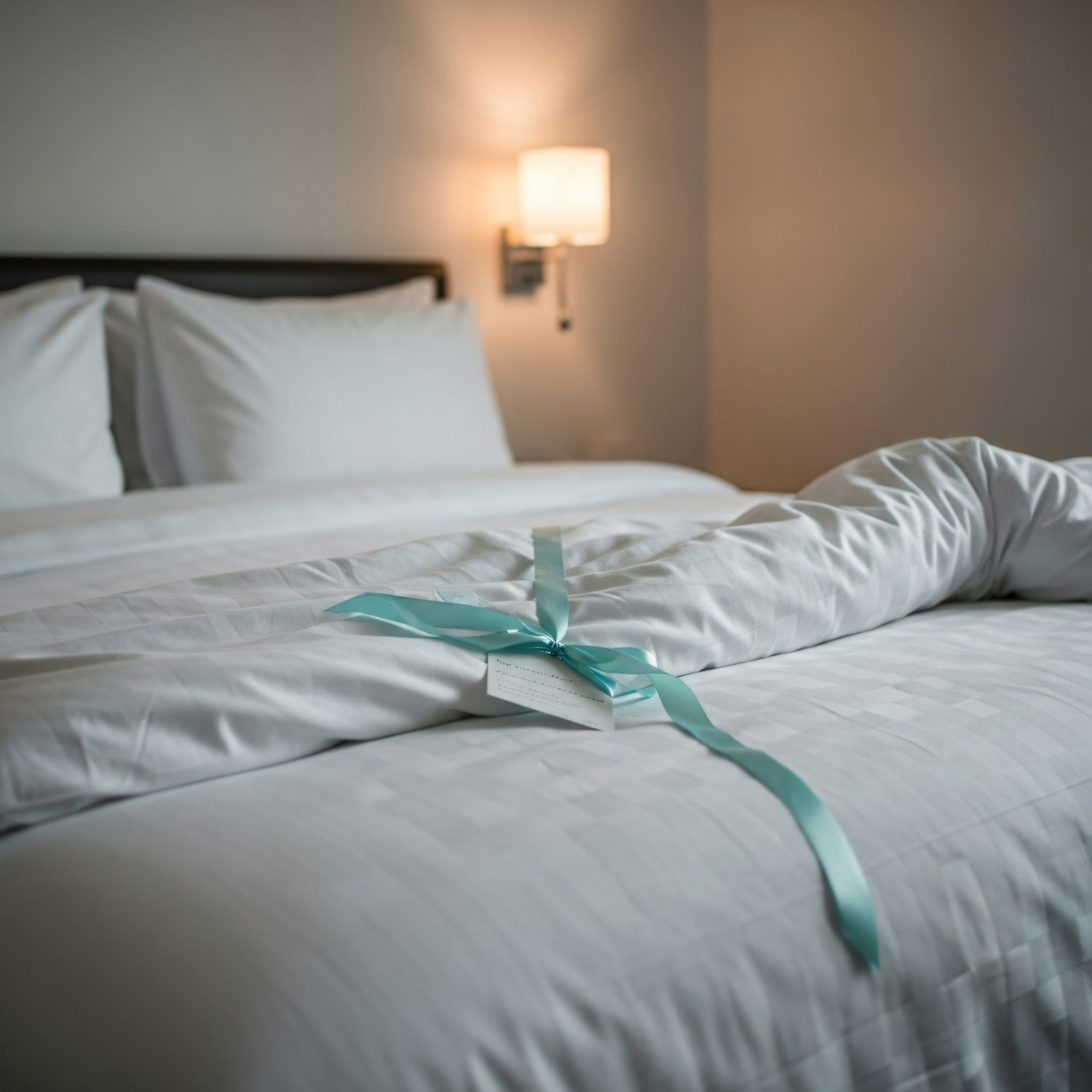 A cozy, well-made bed with white linens, a rolled towel tied with a blue ribbon, and a warm-lit lamp in a serene room.