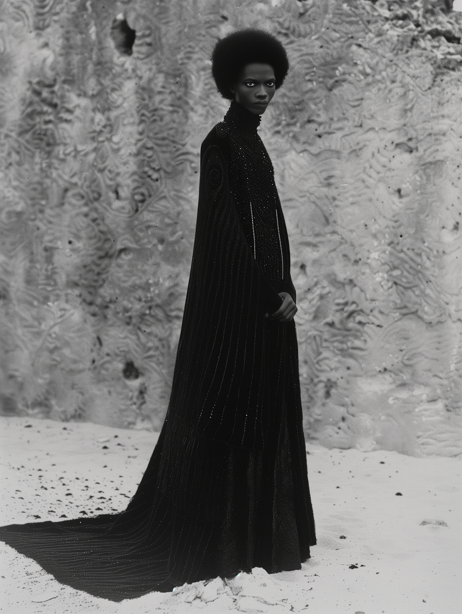 Elegant black woman in a shimmering black gown against a textured, abstract background. Monochrome palette enhances sophistication.