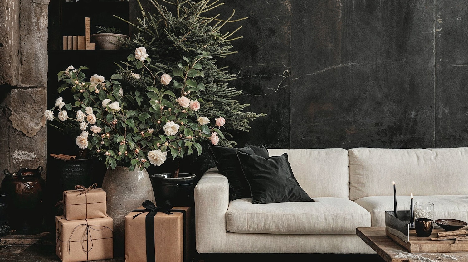 Cozy living room with white sofa, black cushions, potted plant, wrapped gifts, and rustic decor against a dark textured wall.