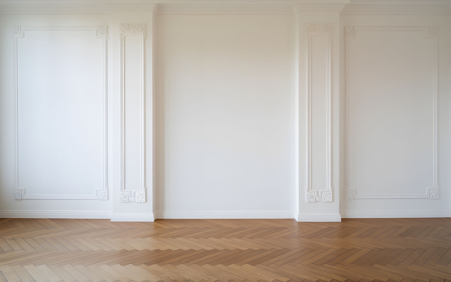 Minimalist interior with white walls, intricate molding, and herringbone wood flooring, creating a clean and elegant aesthetic.