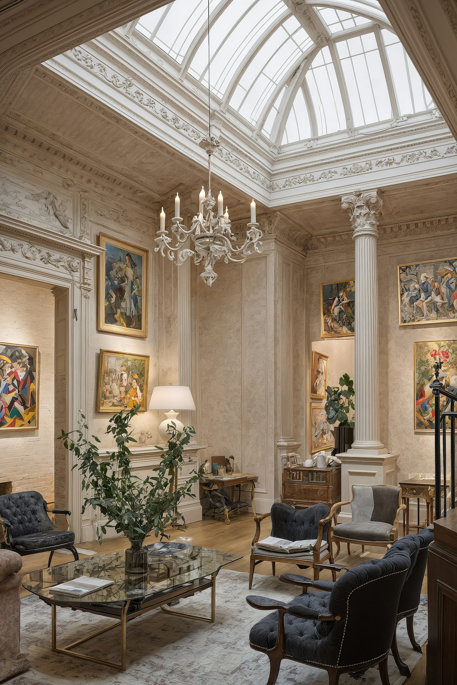 Elegant room with classical columns, a glass dome ceiling, vintage furniture, and framed artwork creating a sophisticated ambiance.