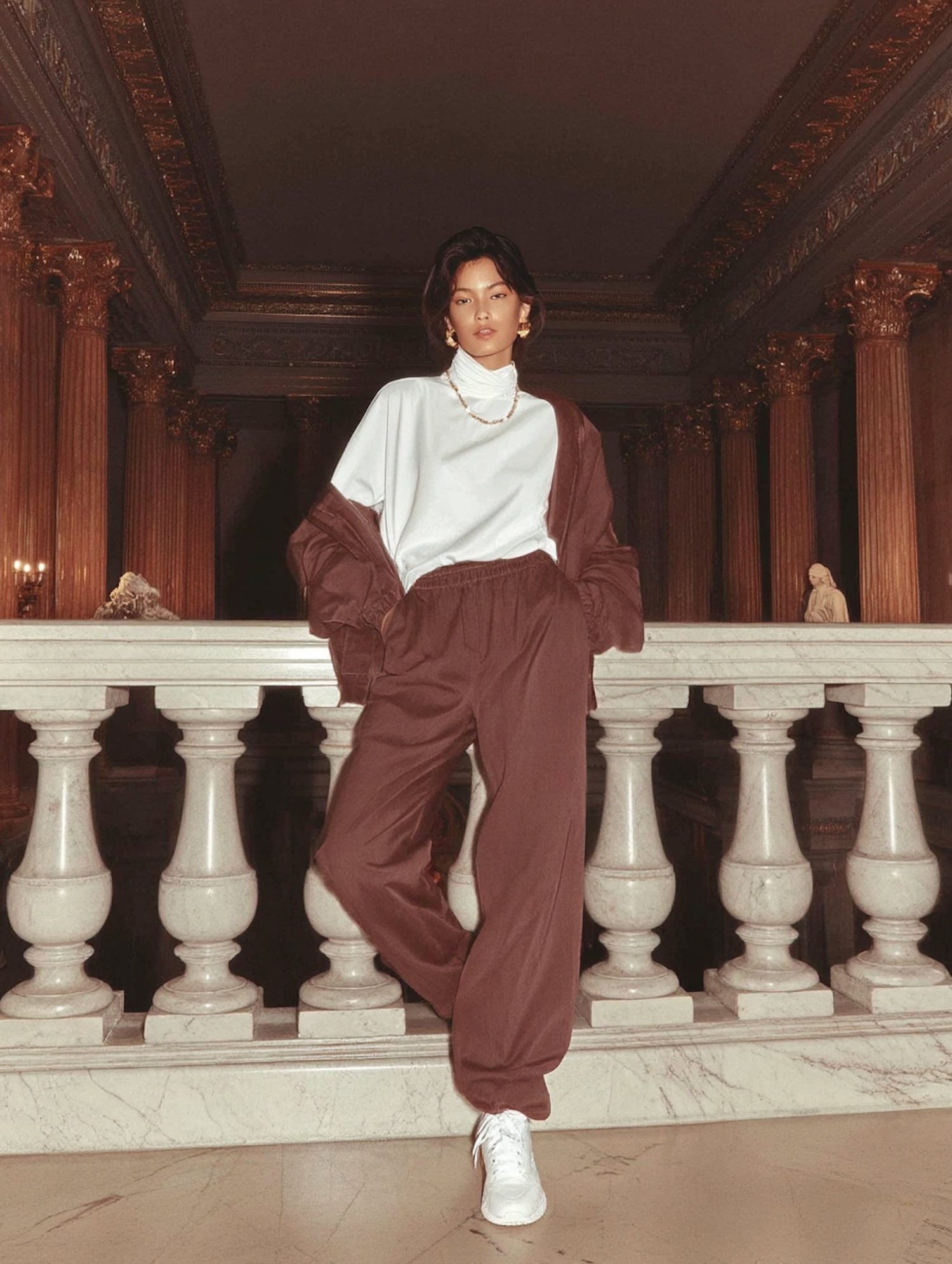 Stylish individual in a white turtleneck and brown outfit, posing in an elegant interior with marble and ornate columns.