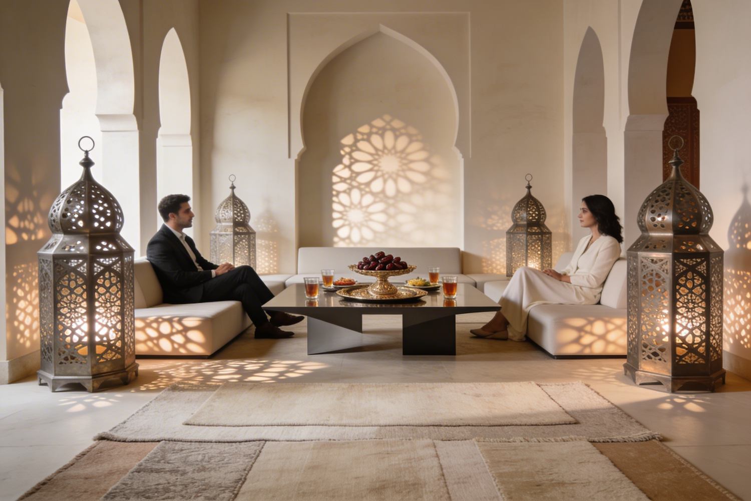 Elegant interior with two people seated, intricate lanterns casting shadows, and a central table with tea and dates, evoking cultural warmth.